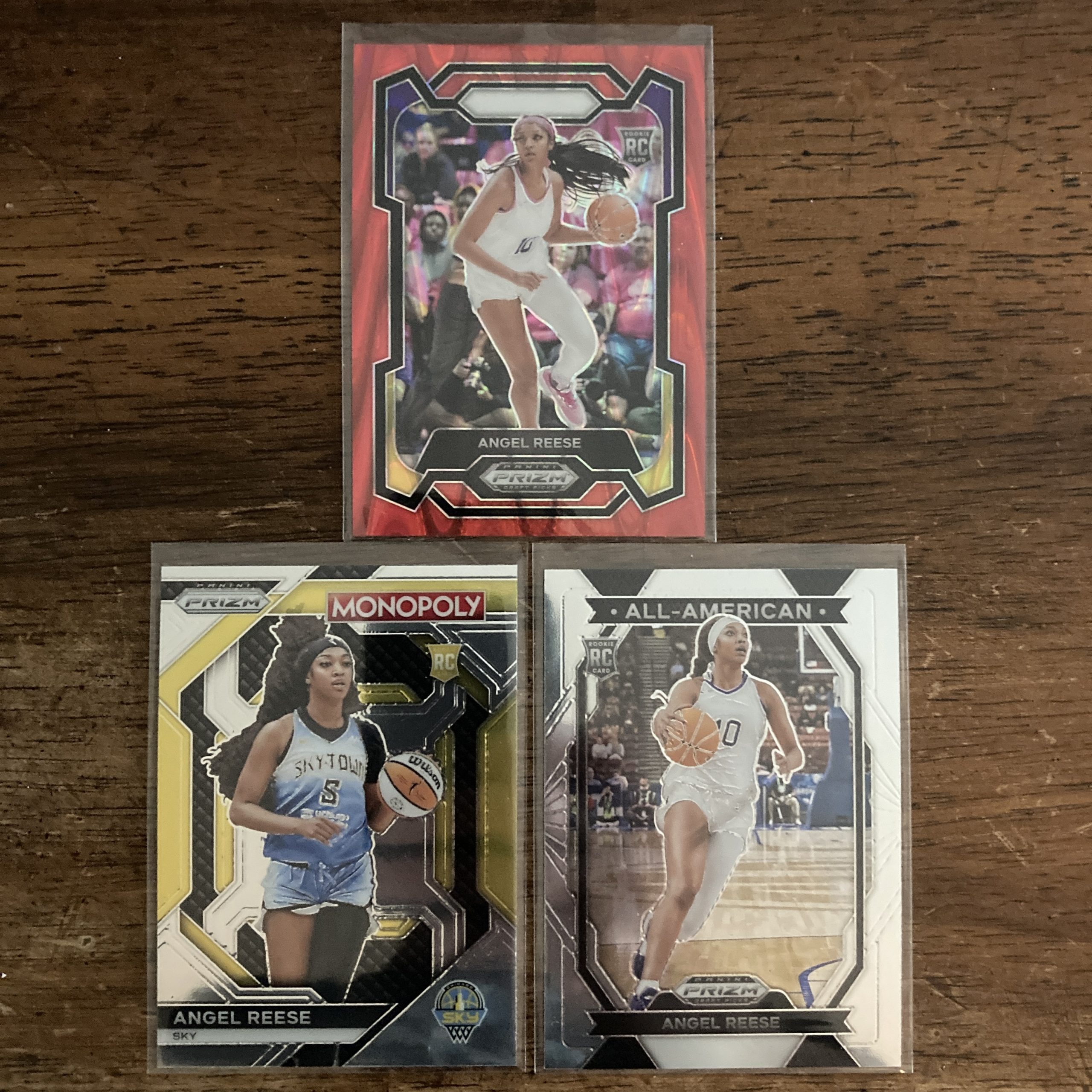 Angel Reese RCs Lot w/SP Red Seismic Prizm (#’ed 164/225), Pack of 3 Basketball Rookie Cards (inv4)