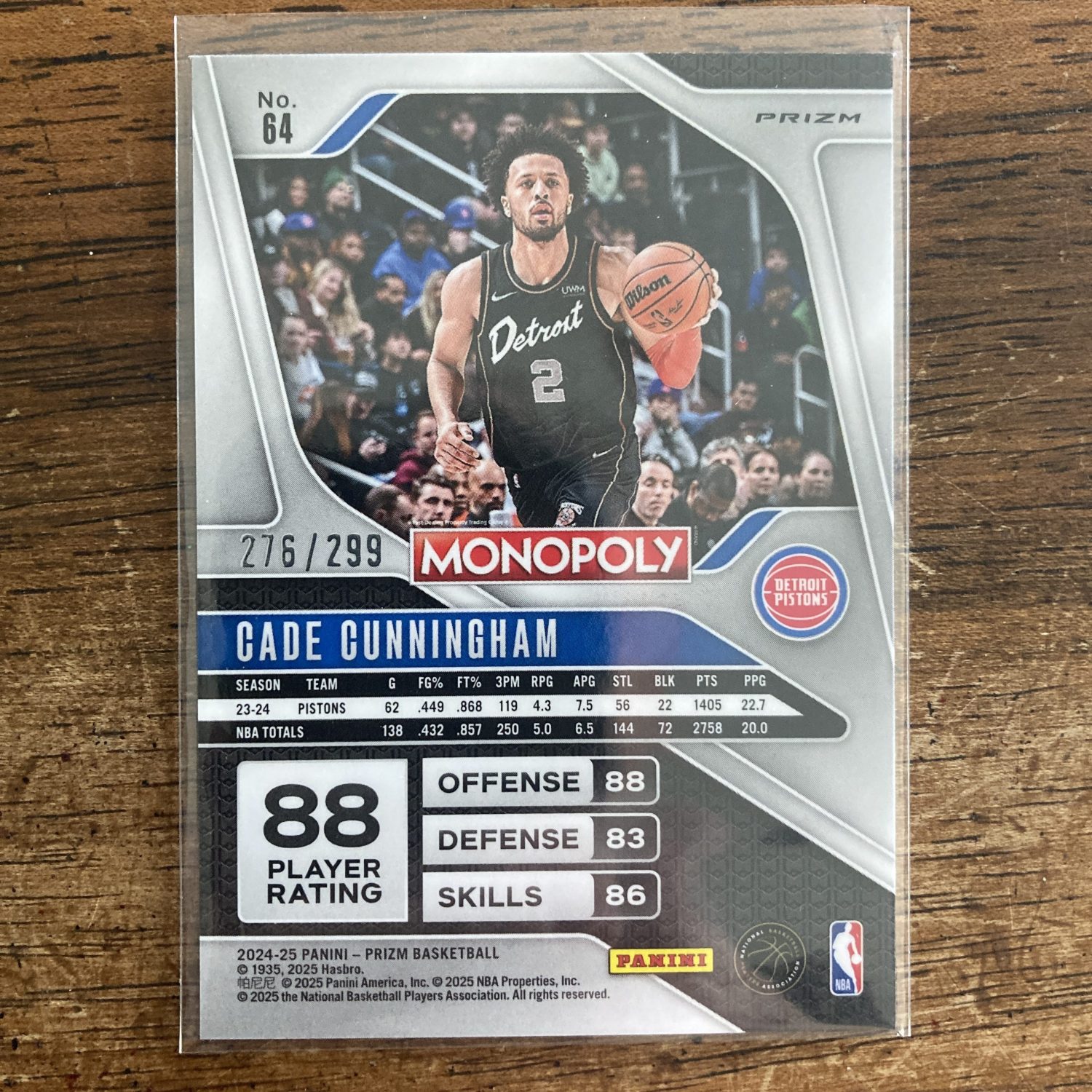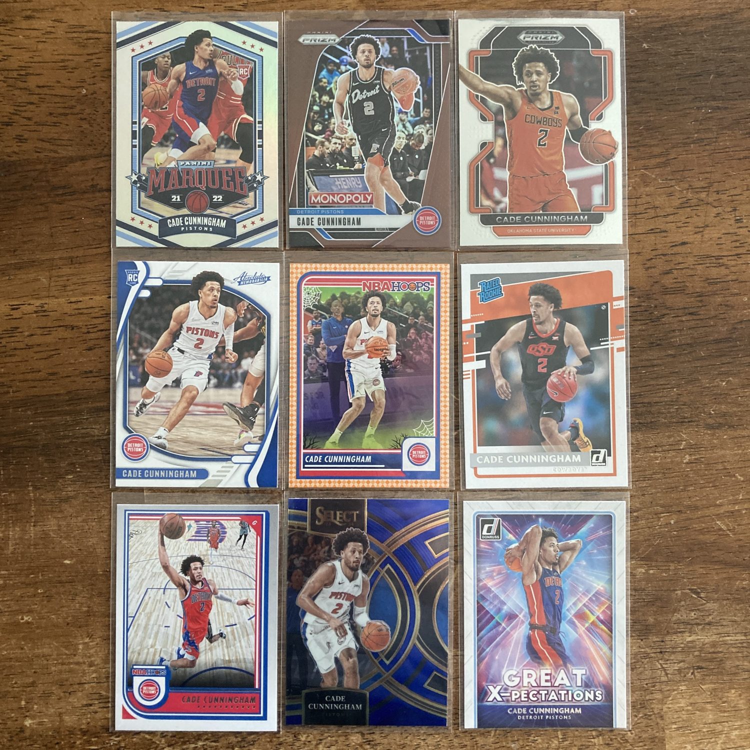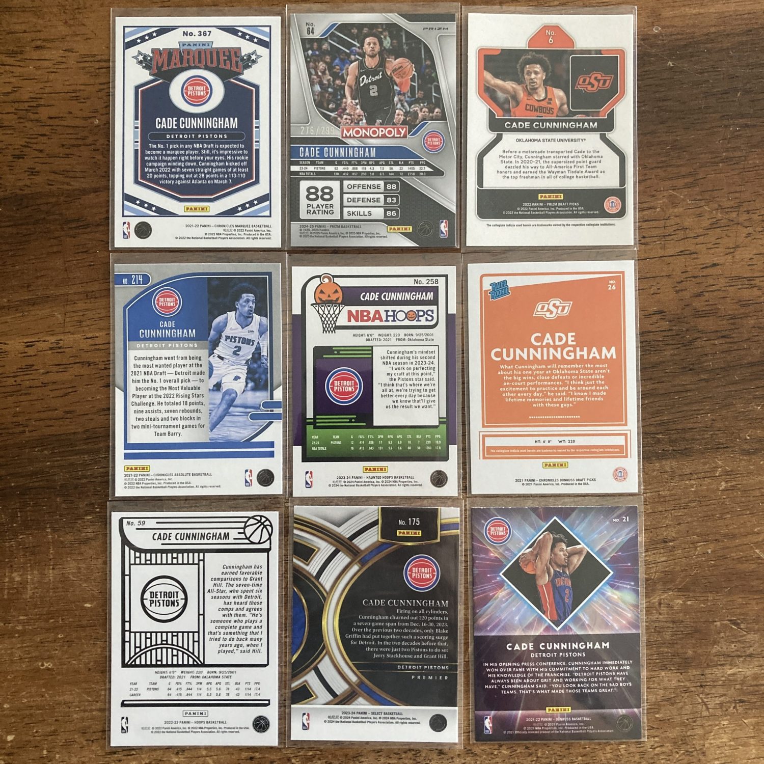 Curated pack of nine different Cade Cunningham basketball cards including a Panini Prizm Monopoly SP Bronze Prizm parallel card, serial numbered 276/299, three RCs, and other cards. Nice instant collection bundle of cards for a basketball fan! You will receive all of the exact cards pictured. Each card will be in a penny sleeve and top loader and they will come in a small pack (team bag) with cover graphic as pictured. Will be shipped very well protected!