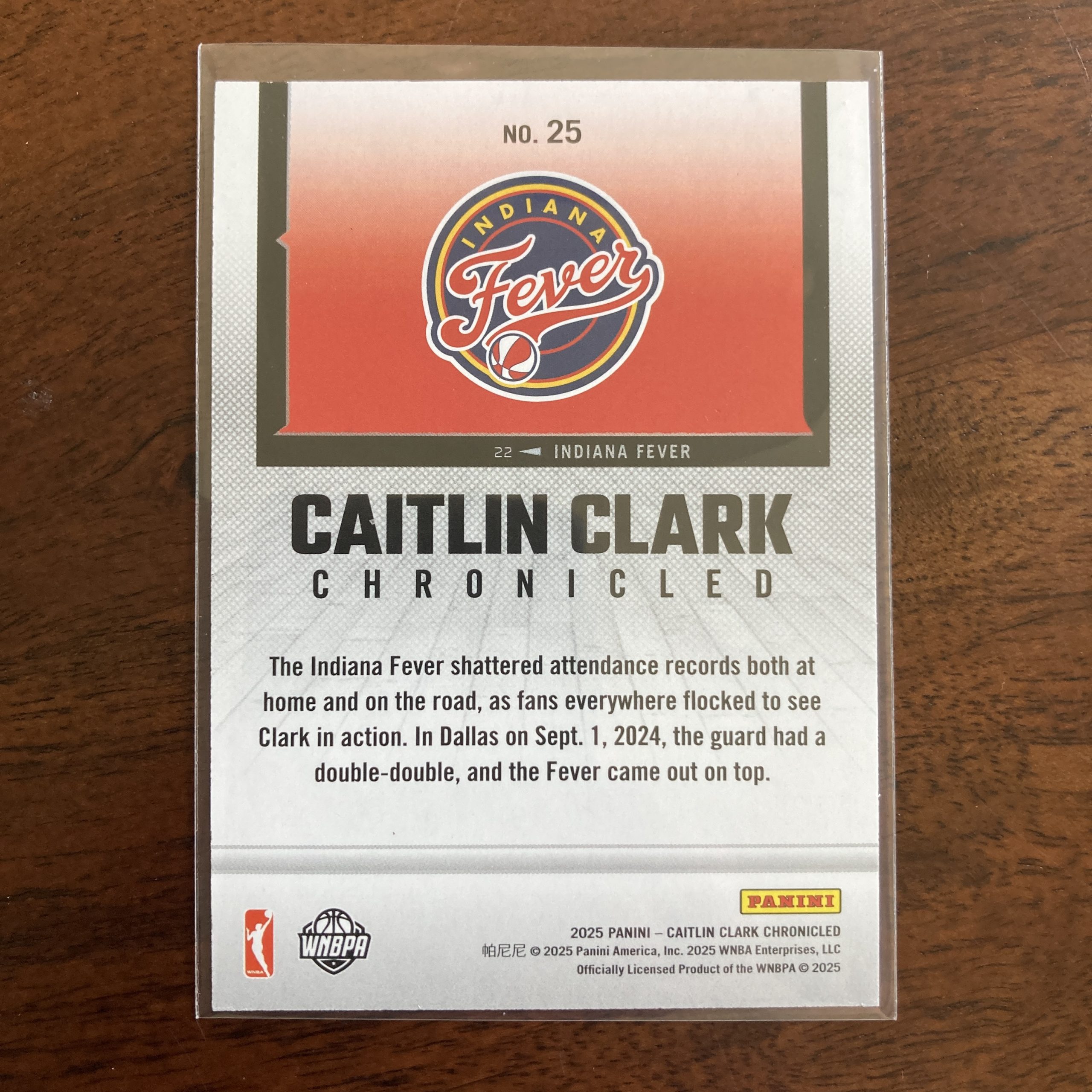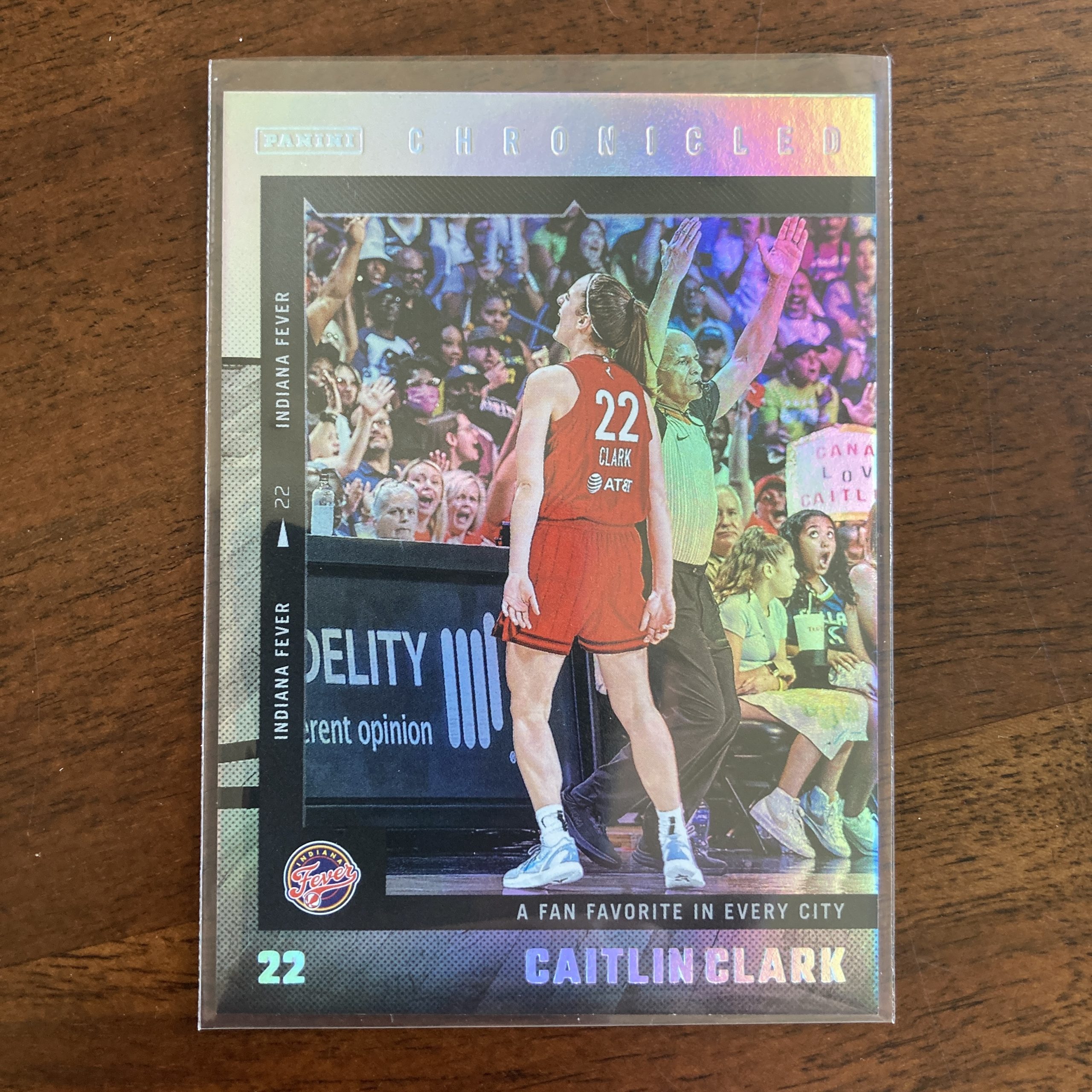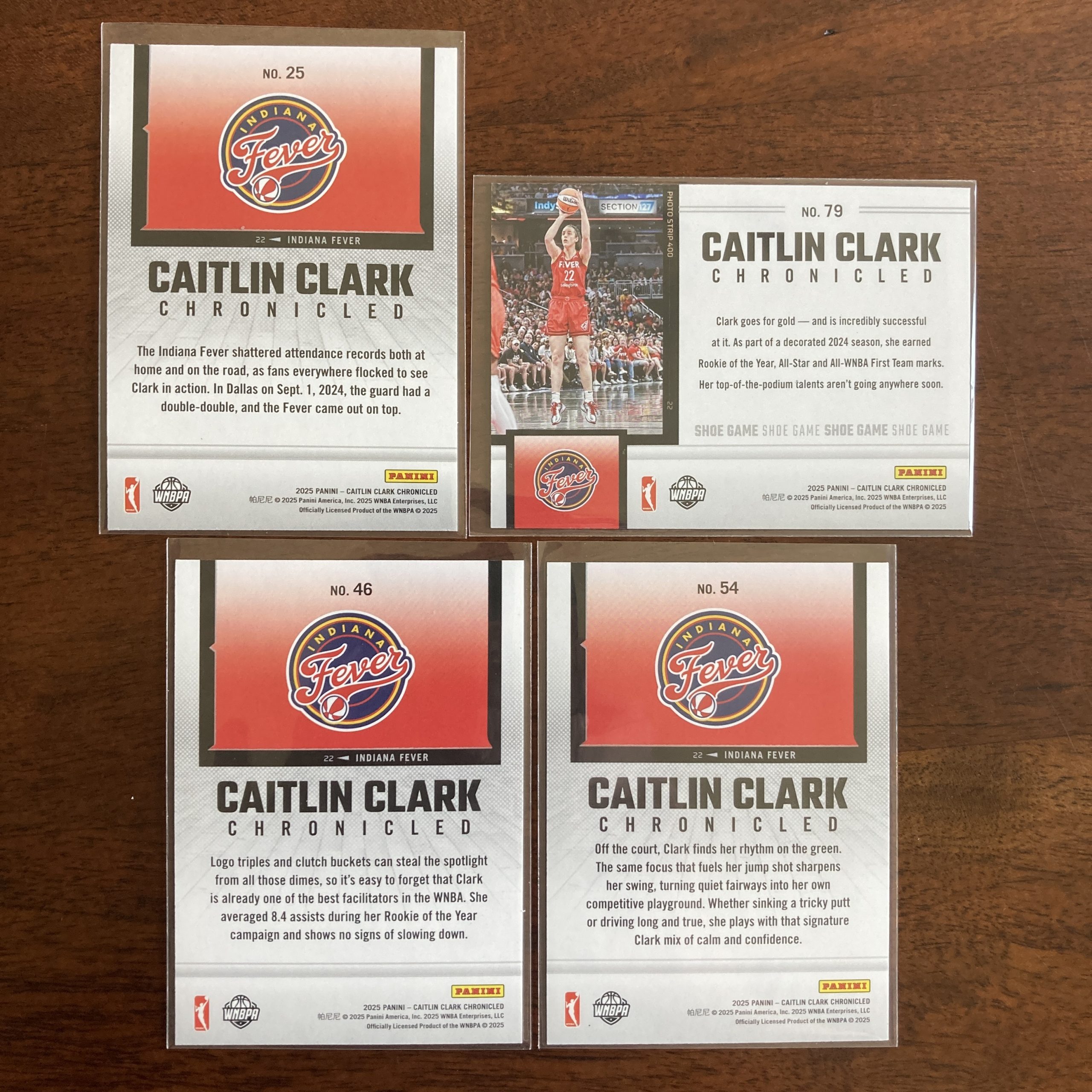 Curated pack of four different Caitlin Clark basketball cards from 2025 Panini Caitlin Clark Chronicled release including an SP Silver Holofoil parallel card. Nice little instant collection bundle of cards for a basketball fan! You will receive all of the exact cards pictured. Each card will be in a penny sleeve and top loader and they will come in a small pack (team bag) with cover graphic as pictured. Will be shipped very well protected and insured!