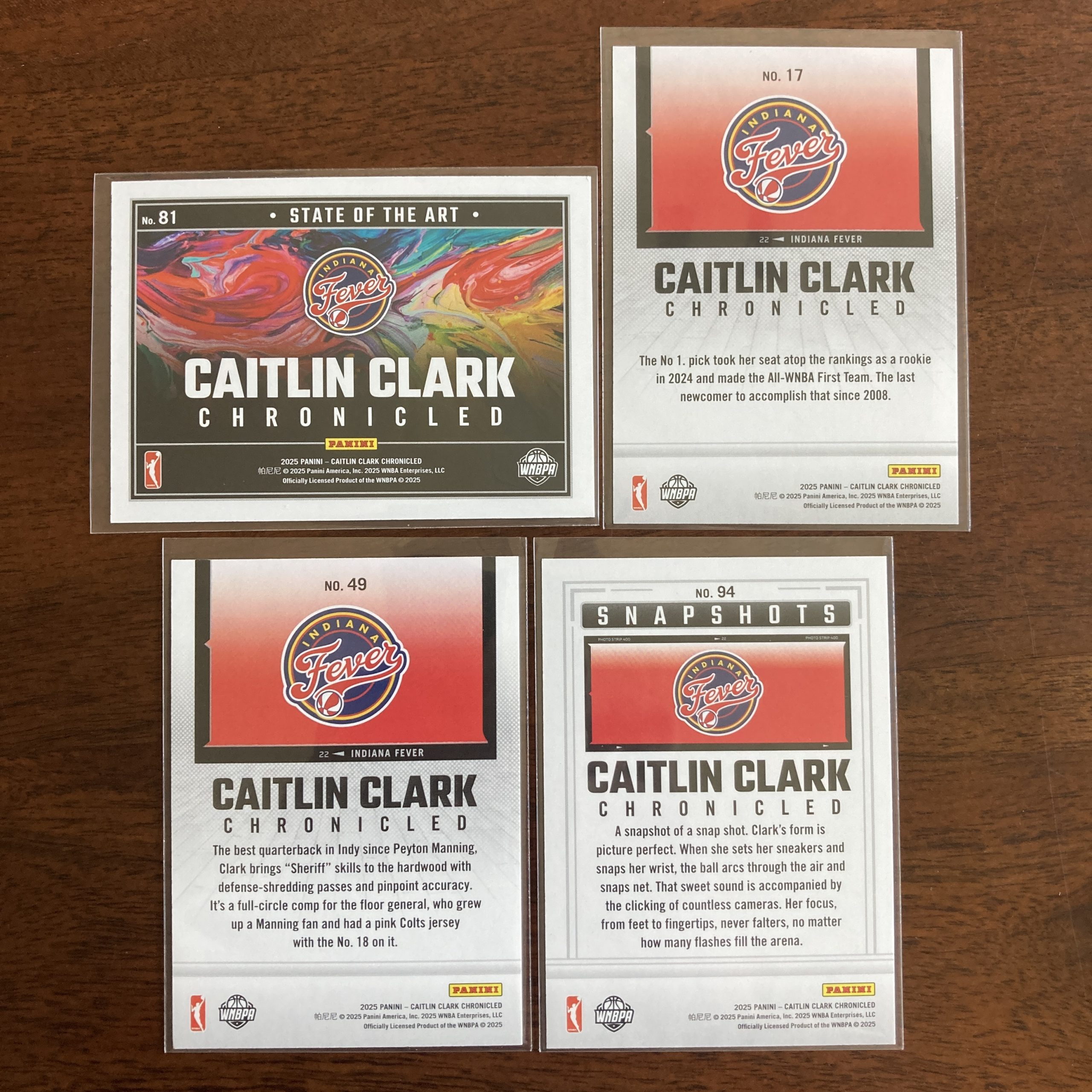 Curated pack of four different Caitlin Clark basketball cards from 2025 Panini Caitlin Clark Chronicled release including a State of the Art SP Silver Holofoil parallel card. Nice little instant collection bundle of cards for a basketball fan! You will receive all of the exact cards pictured. Each card will be in a penny sleeve and top loader and they will come in a small pack (team bag) with cover graphic as pictured. Will be shipped very well protected and insured!
