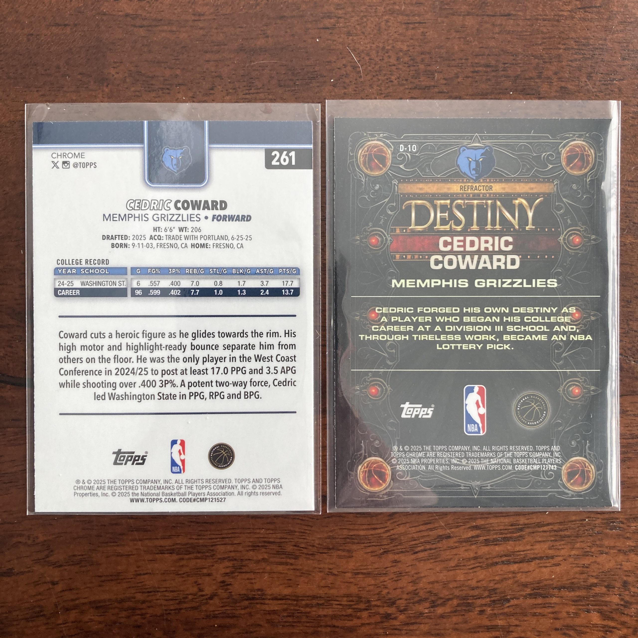 Curated pack of two different Cedric Coward basketball rookie cards from Topps Chrome – SP Pulsar Refractor parallel RC #261 and SP Refractor Destiny insert RC #D-10. Nice little starter collection bundle of cards for a basketball fan! You will receive all of the exact cards pictured. Each card will be in a penny sleeve and top loader and they will come in a small pack (team bag) with cover graphic as pictured. Will be shipped very well protected!