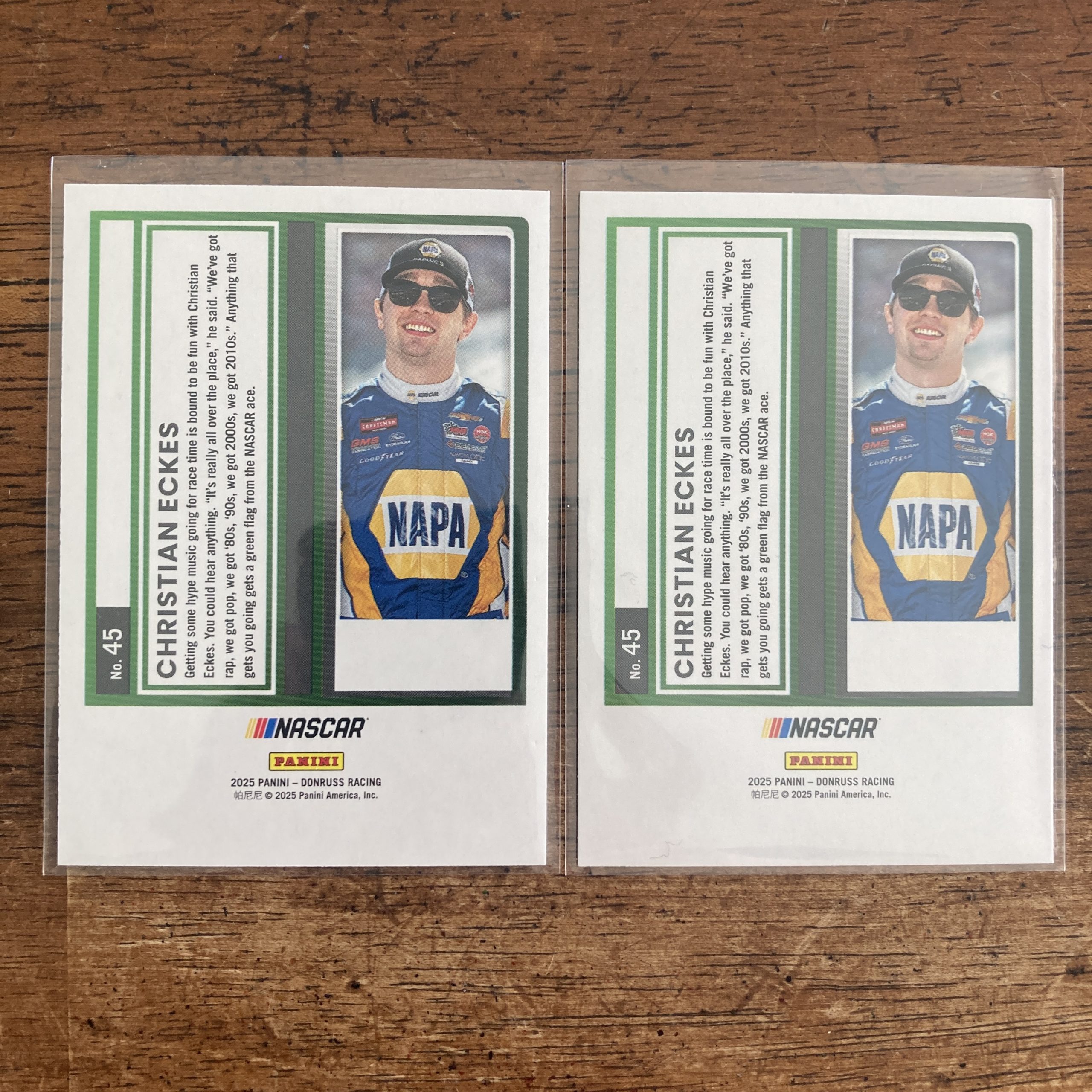 Curated pack of two different Christian Eckes racing cards including a Donruss SP Carolina Blue parallel card, serial numbered 148/249. Nice little instant collection bundle of cards for a racing fan! You will receive all of the exact cards pictured. Each card will be in a penny sleeve and top loader and they will come in a small pack (team bag) with cover graphic as pictured. Will be shipped very well protected!
