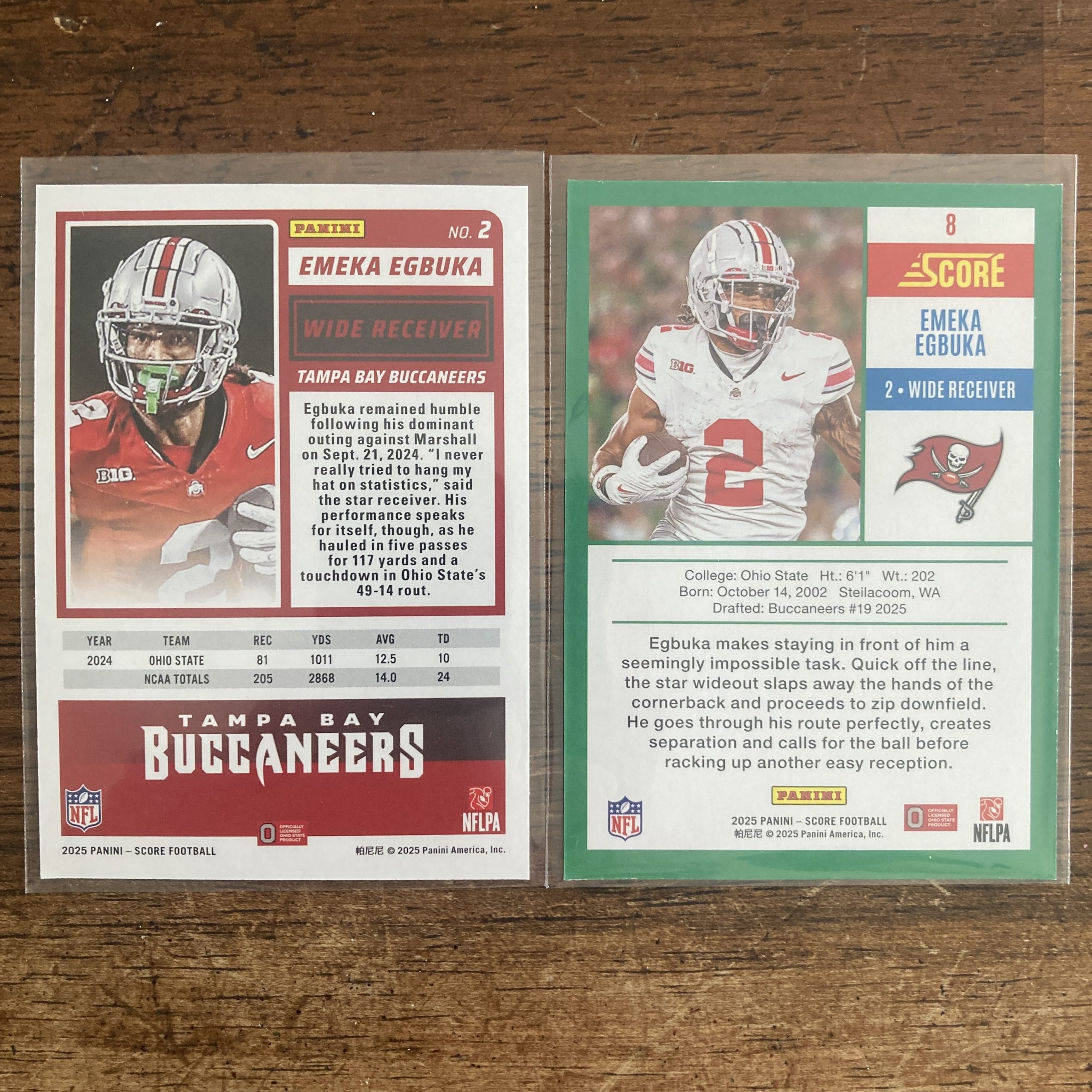 Curated pack of two Emeka Egbuka football rookie cards from Panini Score. Nice little instant collection bundle of cards for a football fan! You will receive all of the exact cards pictured. Each card will be in a penny sleeve and top loader and they will come in a small pack (team bag) with cover graphic as pictured. Will be shipped very well protected!