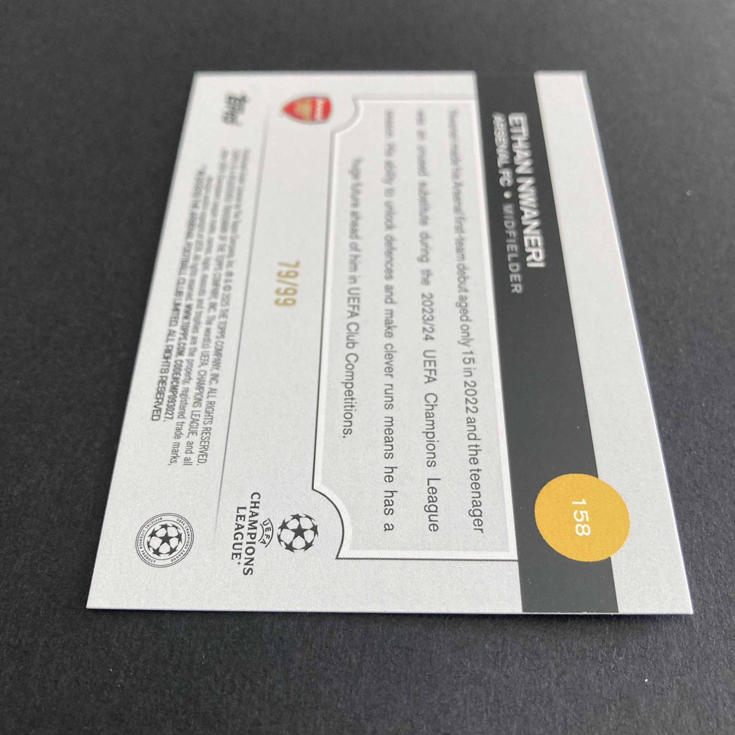 Ethan Nwaneri 2024-25 Topps UEFA Club Competitions SP Green Inferno parallel rookie card #158, serial numbered 79/99. Scarce Arsenal FC collectible RC soccer card. Will be in a penny sleeve and top loader and shipped very well protected!