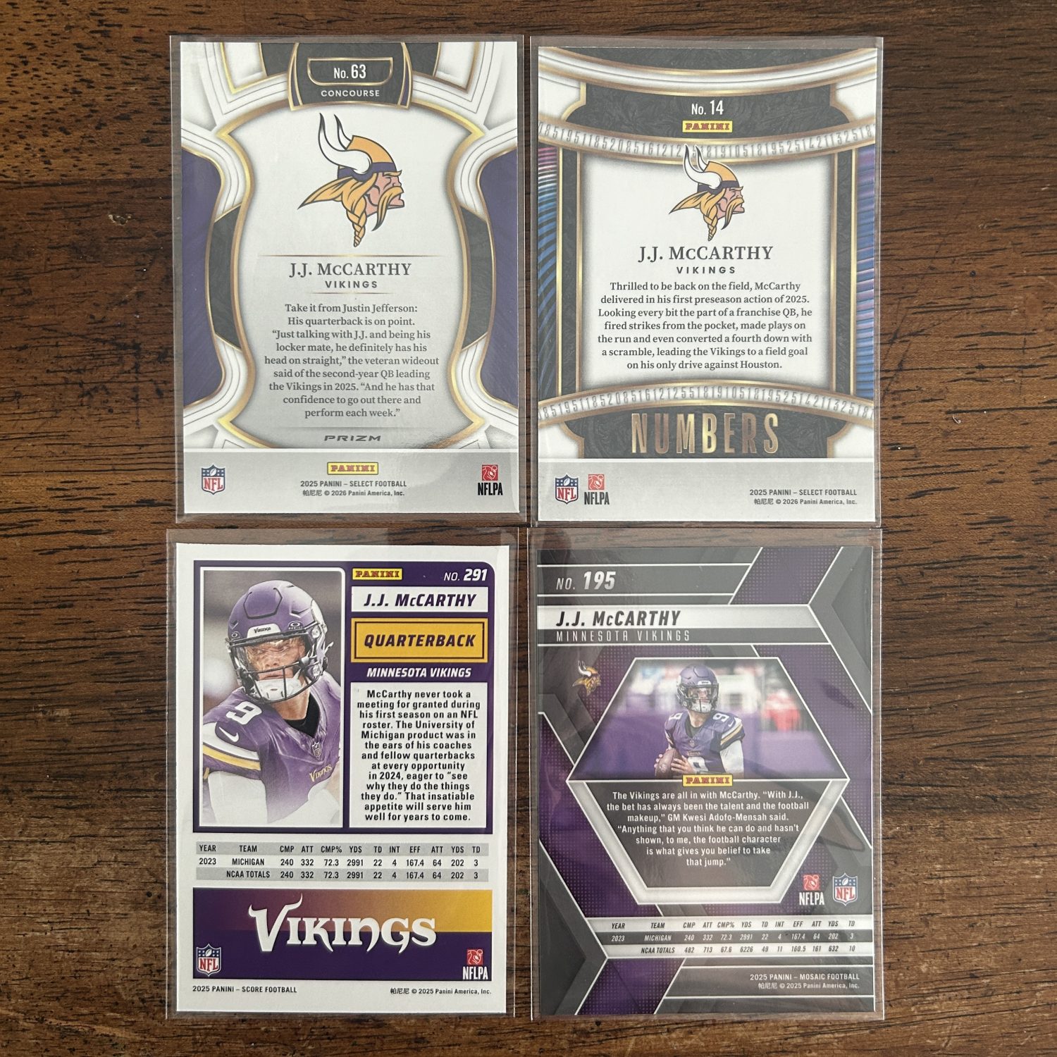 J.J. McCarthy Pack w/SP Pink Shock Prizm, Lot of 4 Football Cards, JJ (inv6)