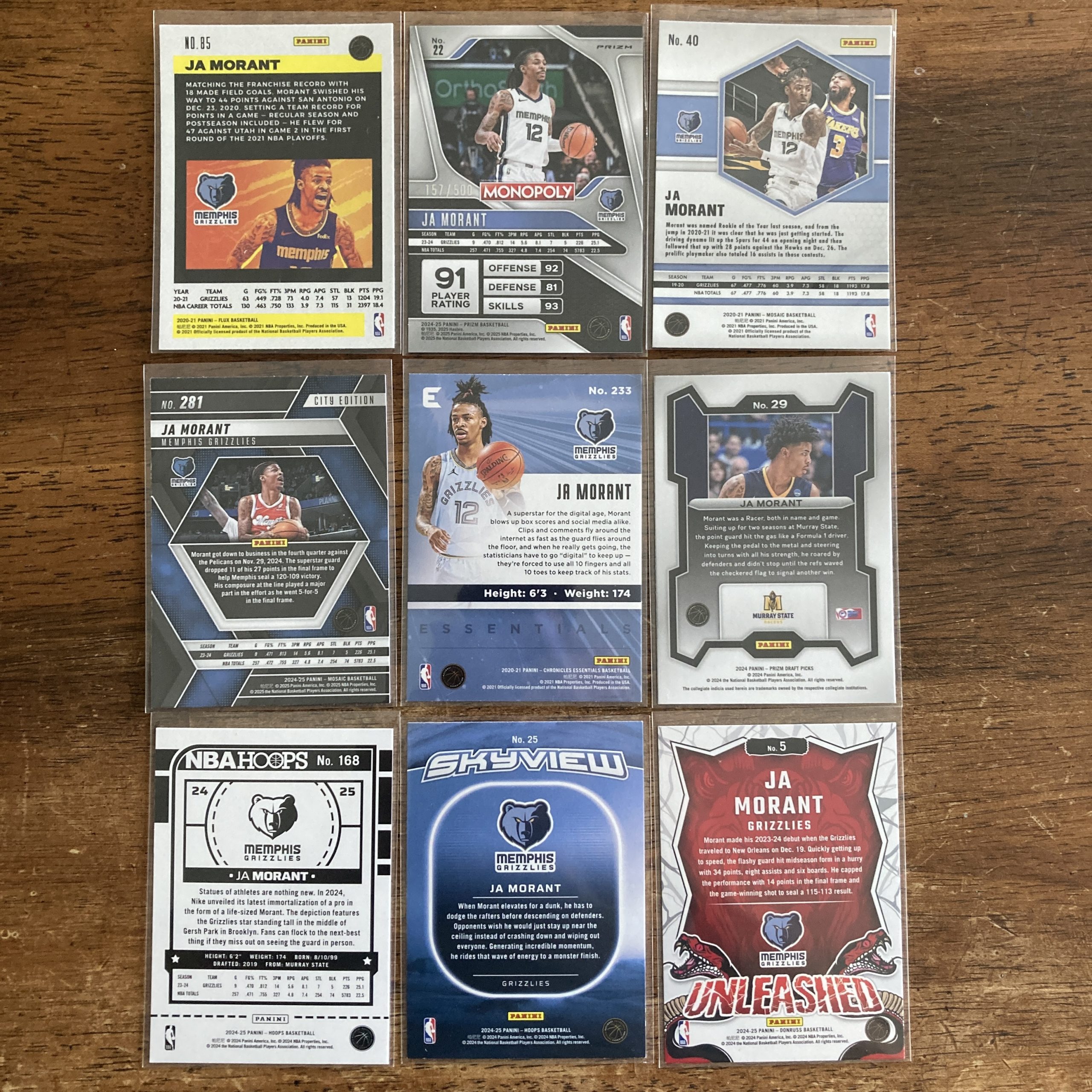 Curated pack of nine different Ja Morant basketball cards including a Panini Prizm Monopoly SP Gold Millionaire Shimmer Prizm parallel card, serial numbered 157/500. Nice instant collection bundle of cards for a basketball fan! You will receive all of the exact cards pictured. Each card will be in a penny sleeve and top loader and they will come in a small pack (team bag) with cover graphic as pictured. Will be shipped very well protected!