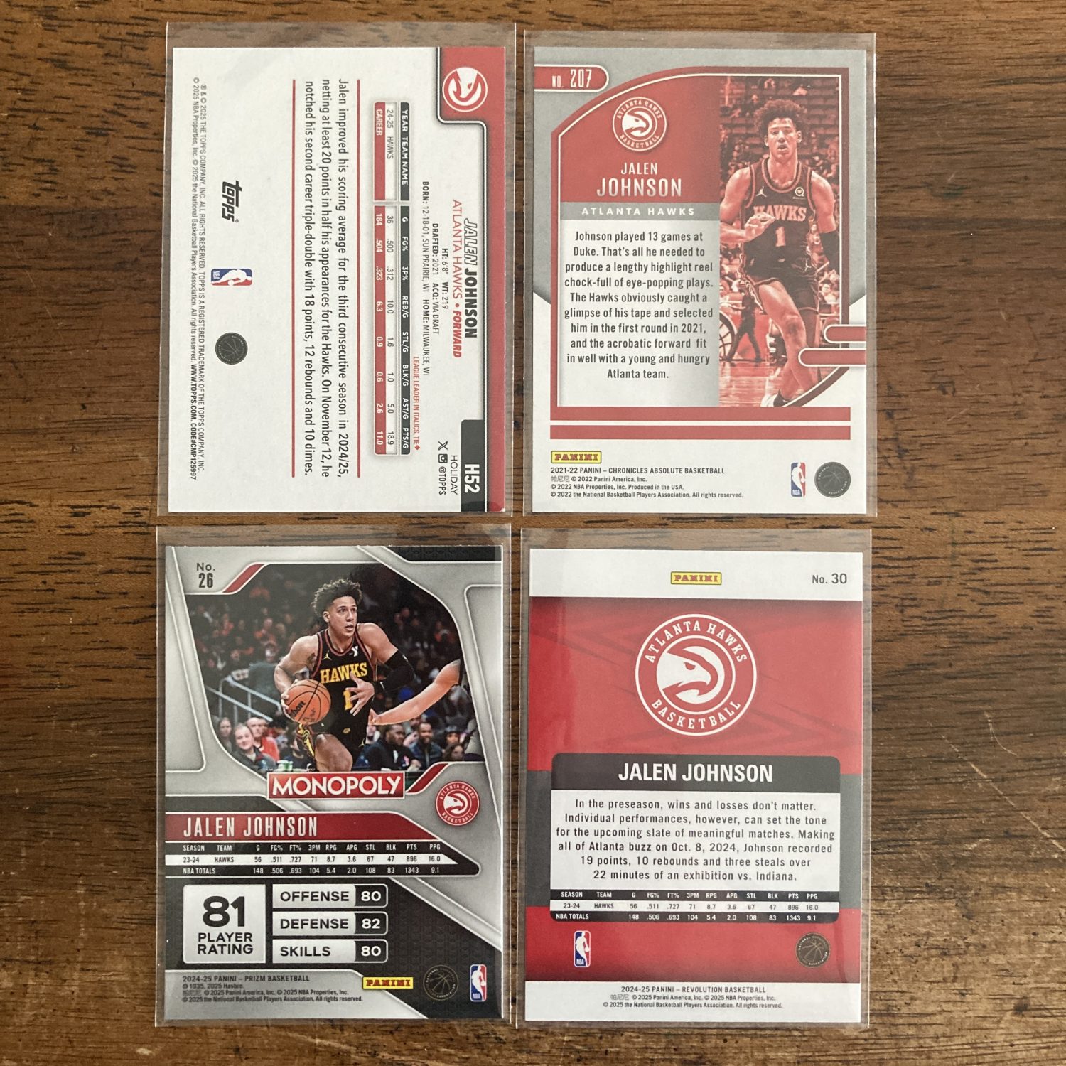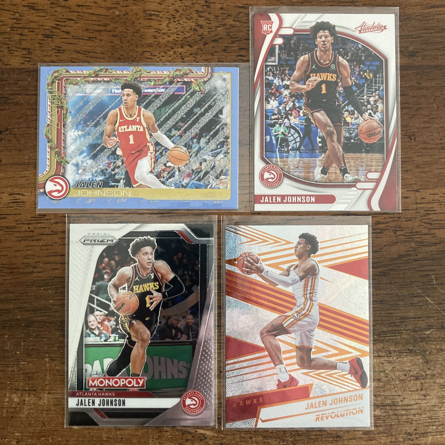 Curated pack of four different Jalen Johnson basketball cards including a Topps Holiday Light Blue & White Glitter parallel card and a Panini Chronicles Absolute rookie card. Nice little instant collection bundle of cards for a basketball fan! You will receive all of the exact cards pictured. Each card will be in a penny sleeve and top loader and they will come in a small pack (team bag) with cover graphic as pictured. Will be shipped very well protected!
