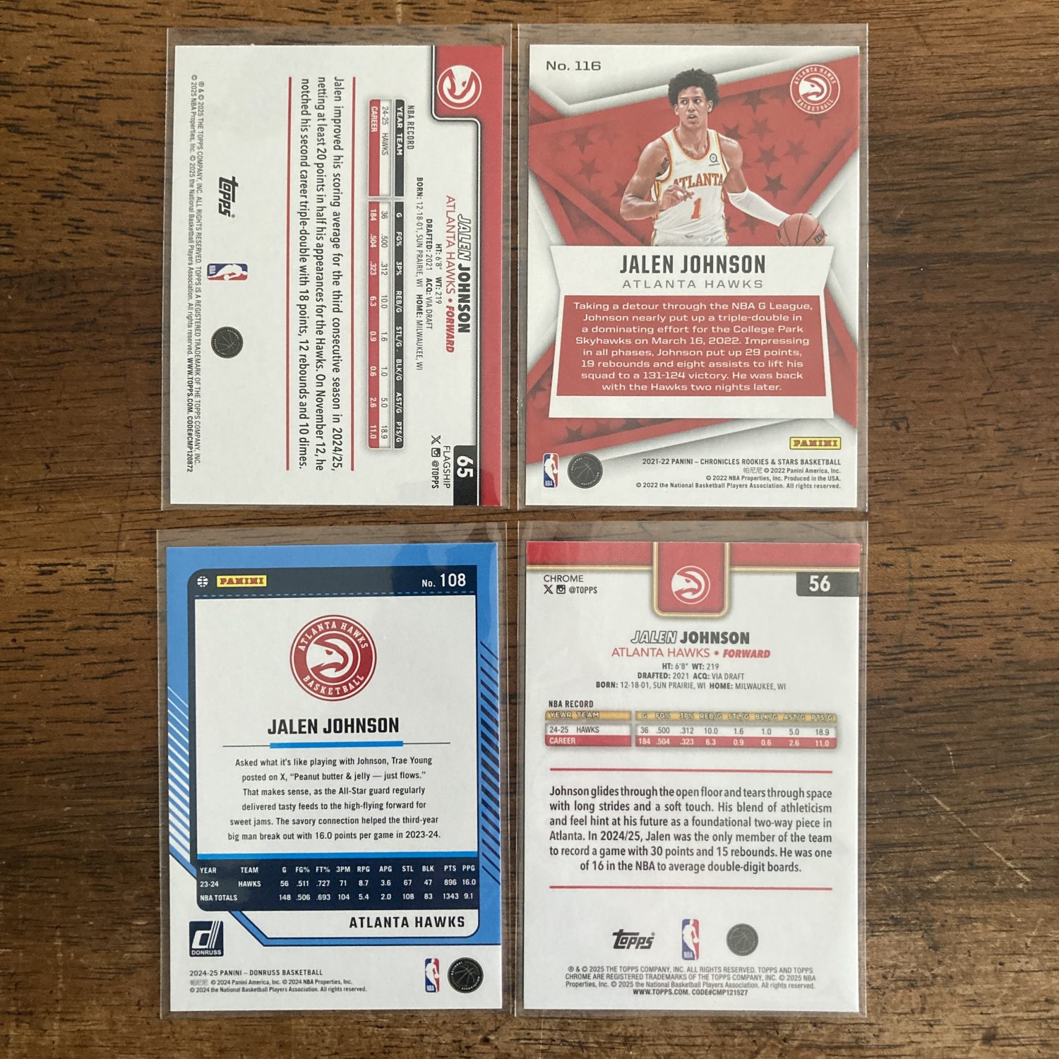 Curated pack of four different Jalen Johnson basketball cards including a Topps Silver Diamante Foil parallel card and a Panini Chronicles Rookies & Stars rookie card. Nice little instant collection bundle of cards for a basketball fan! You will receive all of the exact cards pictured. Each card will be in a penny sleeve and top loader and they will come in a small pack (team bag) with cover graphic as pictured. Will be shipped very well protected!