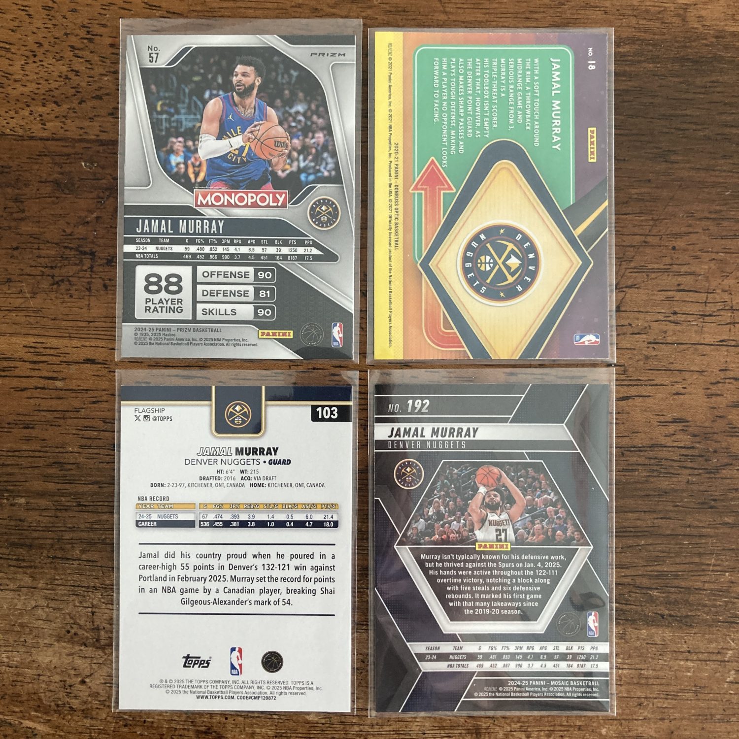 Curated pack of four different Jamal Murray basketball cards including a Panini Prizm Monopoly Red Wave Prizm parallel card. Nice little instant collection bundle of cards for a basketball fan! You will receive all of the exact cards pictured. Each card will be in a penny sleeve and top loader and they will come in a small pack (team bag) with cover graphic as pictured. Will be shipped very well protected!