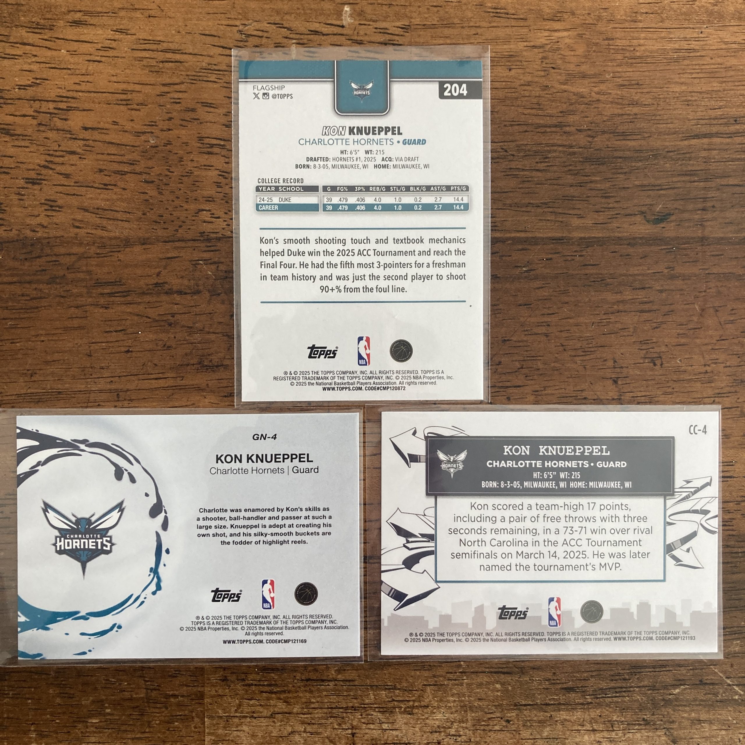 Curated pack of three different Kon Knueppel basketball rookie cards including Topps SP Rainbow Foil parallel rookie #204 and Topps Generation Now and Clutch City Prospects insert RCs. Nice little instant collection bundle of cards for a basketball fan! You will receive all of the exact cards pictured. Each card will be in a penny sleeve and top loader and they will come in a small pack (team bag) with cover graphic as pictured. Will be shipped very well protected!