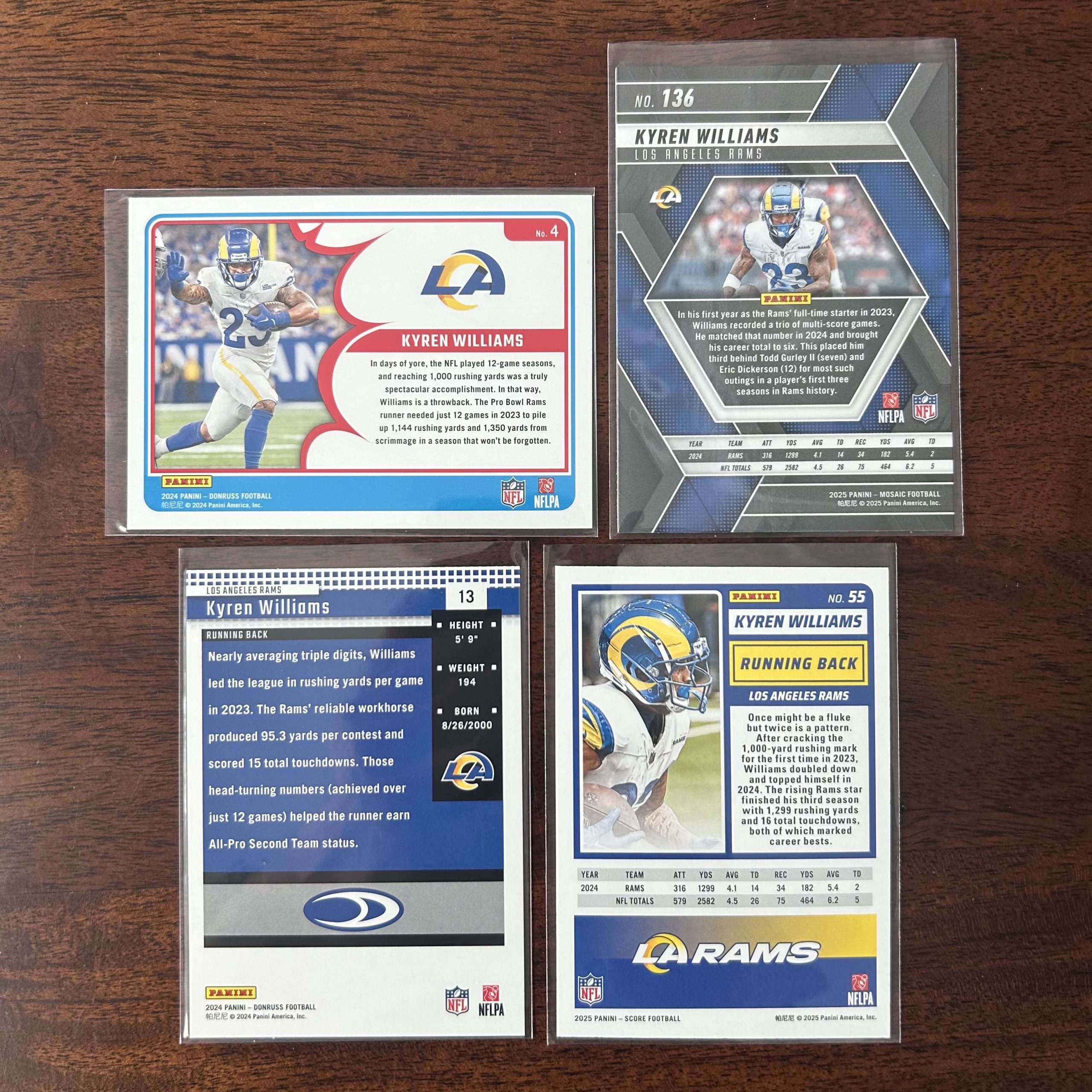 Tags: action all pros, bundle, collection, donruss, Football, holo foil, holofoil, insert, kyren williams, la, Los Angeles, lot, mosaic, NFL, pack, panini, parallel, prizm, Rams, score