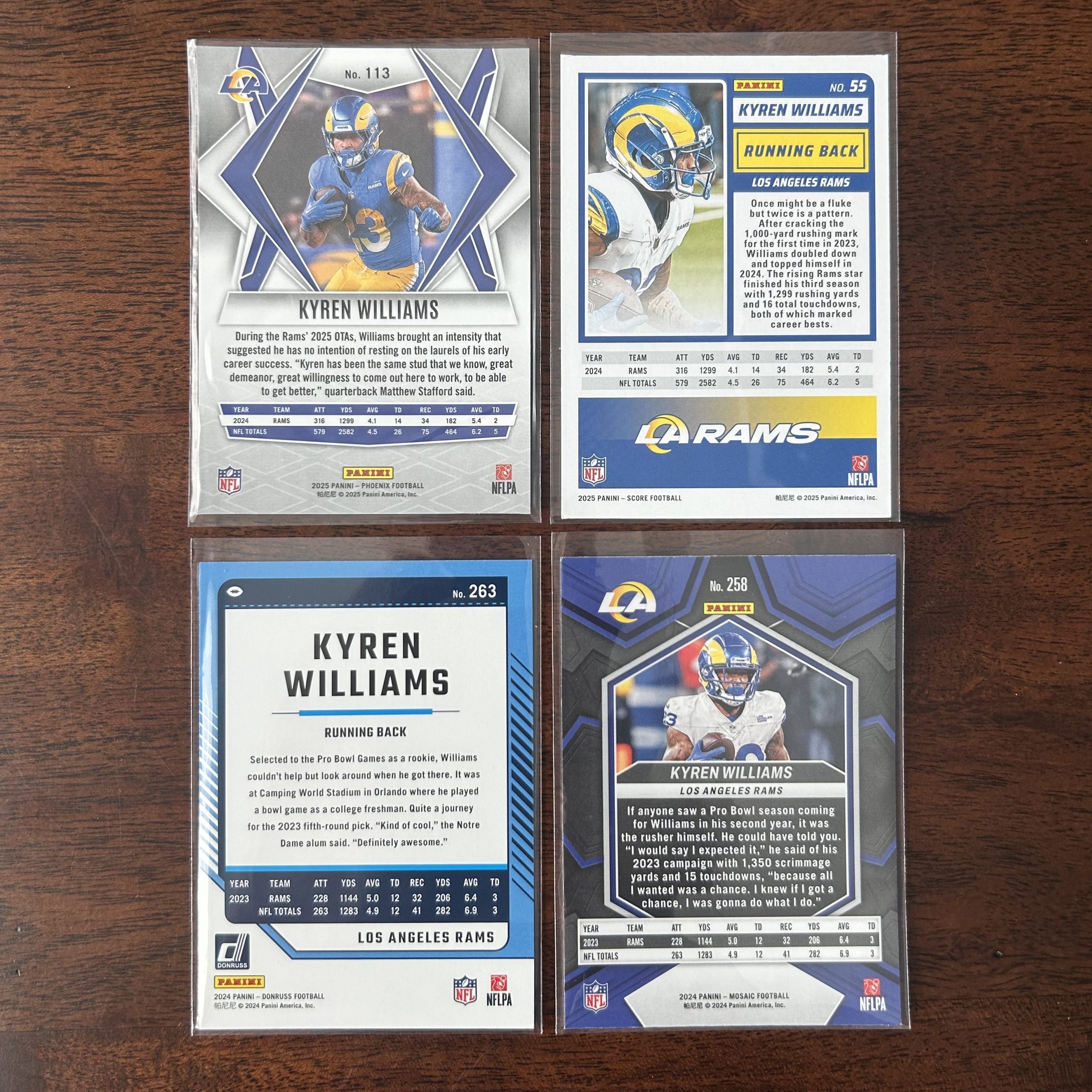 Curated pack of four different Kyren Williams football cards including a Phoenix SP Silver Prizm parallel. Great instant collection bundle of cards for a football fan! You will receive all of the exact cards pictured. Each card will be in a penny sleeve and top loader and they will come in a small pack (team bag) with cover graphic as pictured. Will be shipped very well protected!