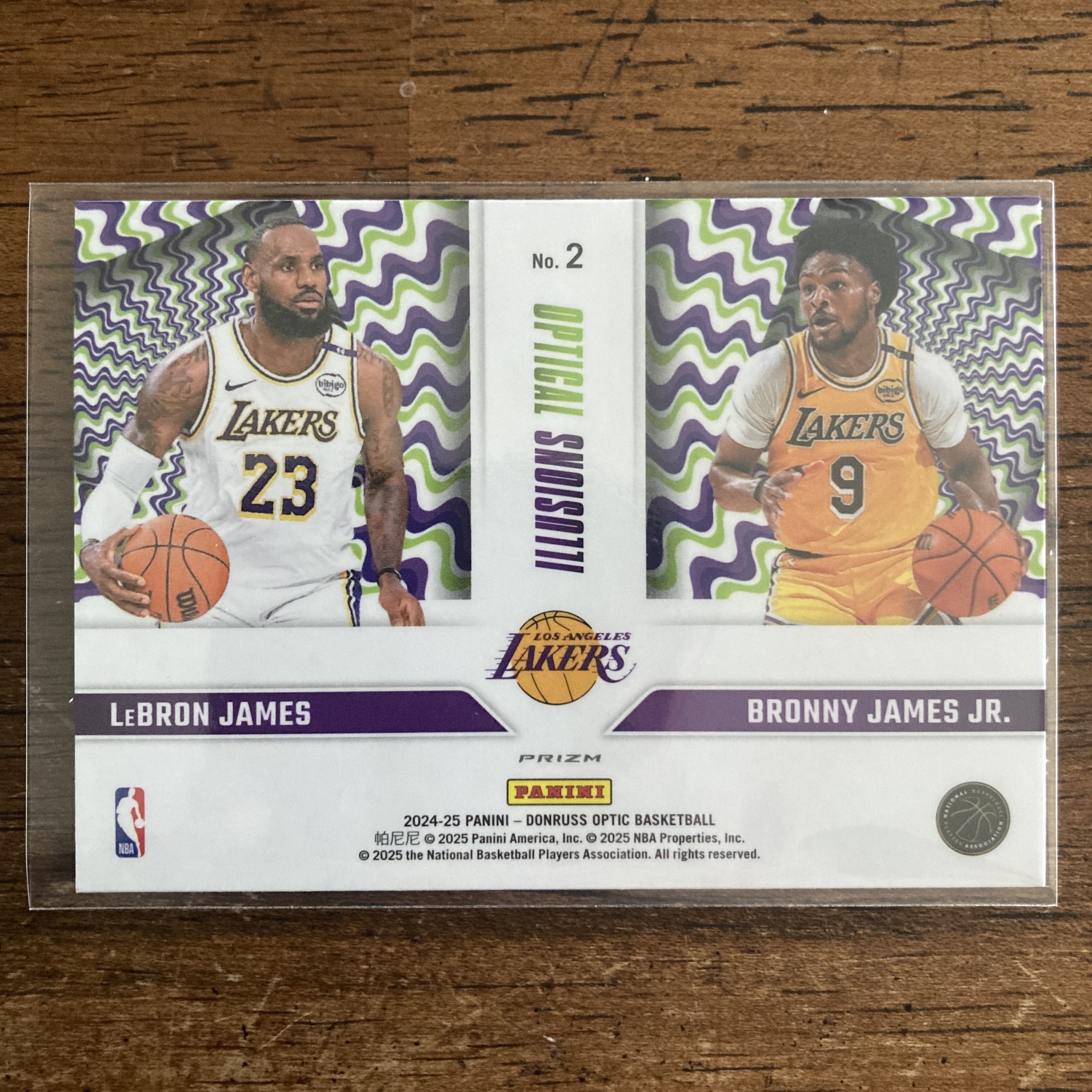 Curated pack of five different LeBron and Bronny James Jr. basketball insert cards including a Panini Donruss Optic Optical Illusions SP Purple Prizm holo parallel insert card featuring them both. Nice little instant collection bundle of cards for a basketball fan! You will receive all of the exact cards pictured. Each card will be in a penny sleeve and top loader and they will come in a small pack (team bag) with cover graphic as pictured. Will be shipped very well protected!