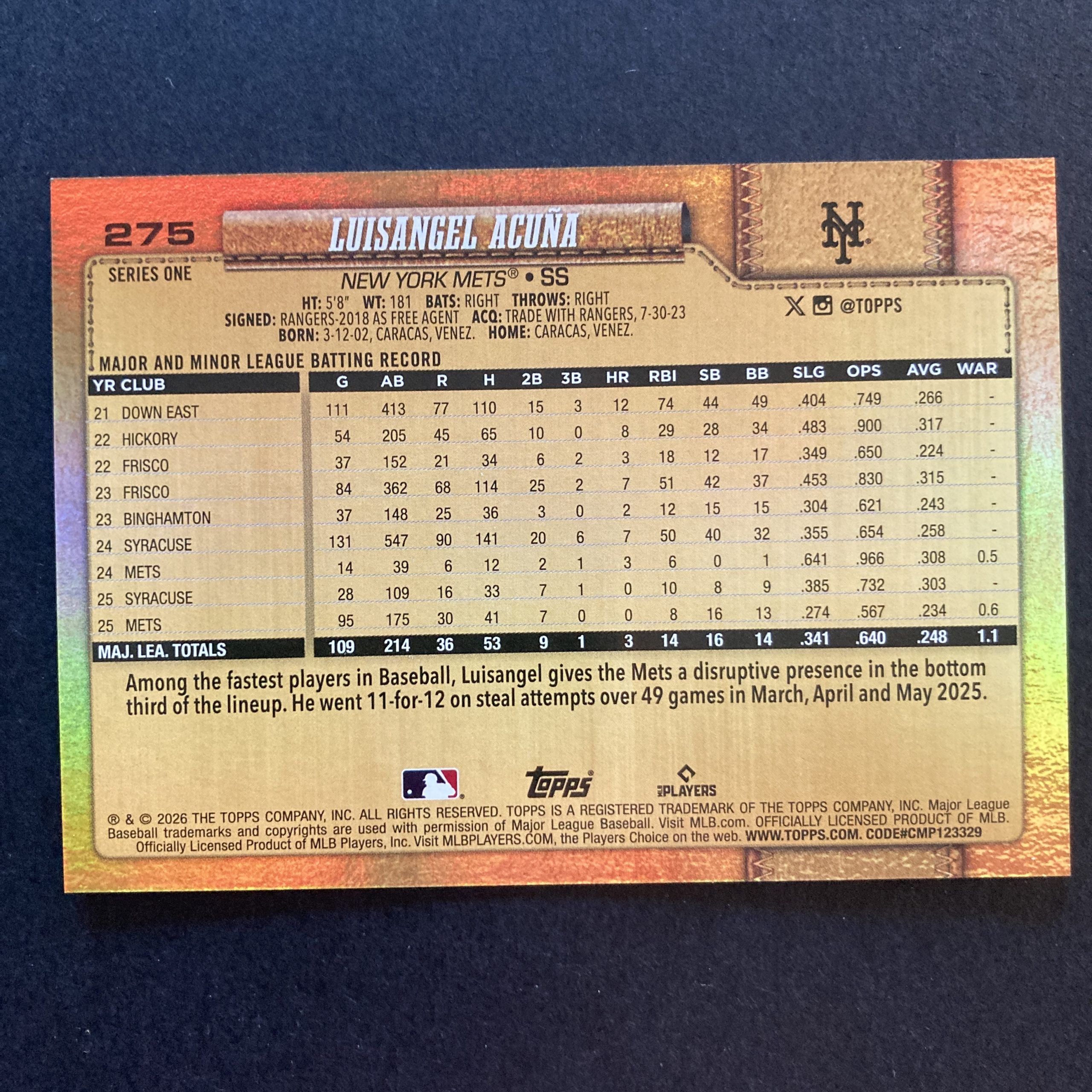 Tags: Baseball, bundle, case hit, foil, future stars, gold, golden mirror, holofoil, image variation, lot, luisangel acuna, Mets, New York, pack, photo variation, sp, ssp, super short print, team, topps