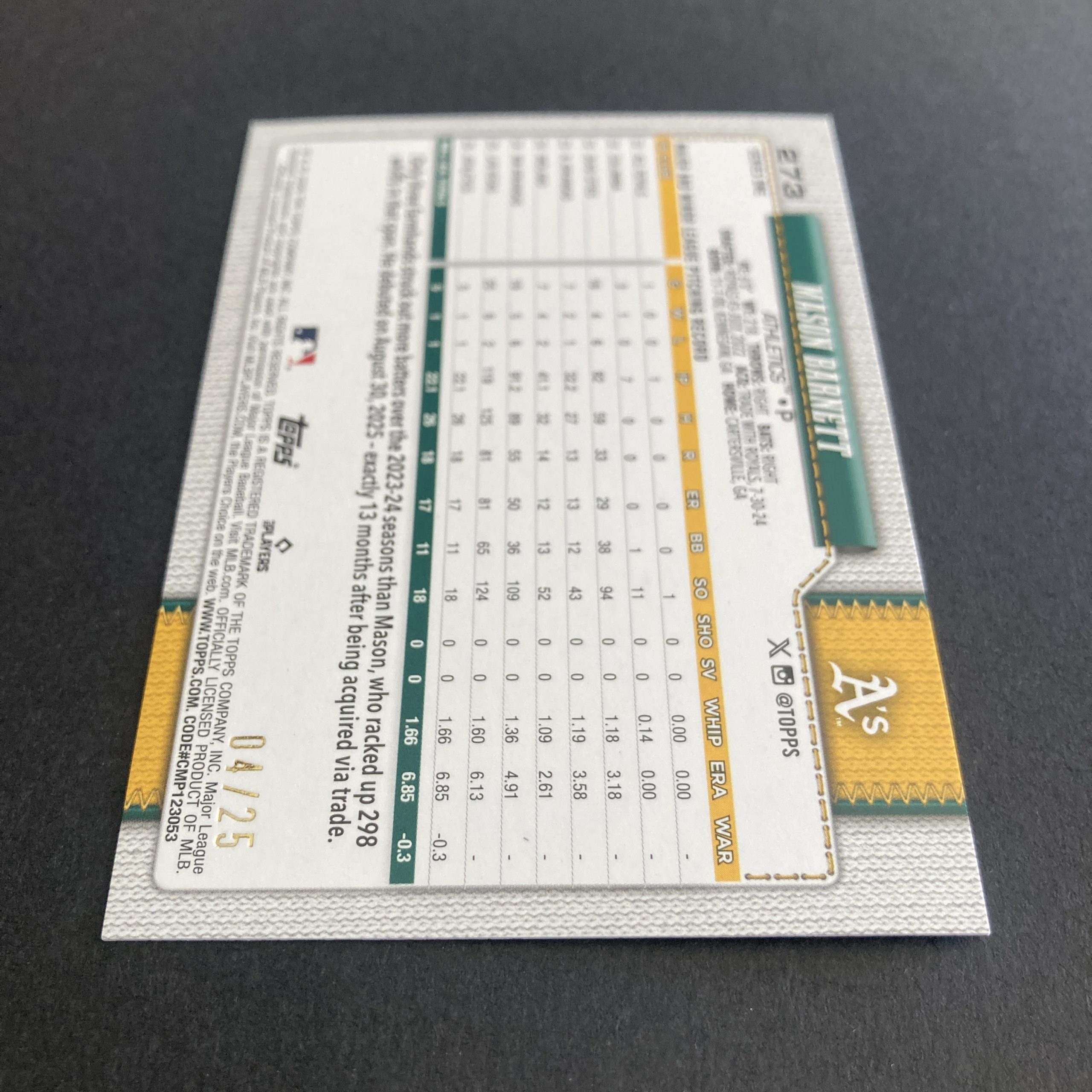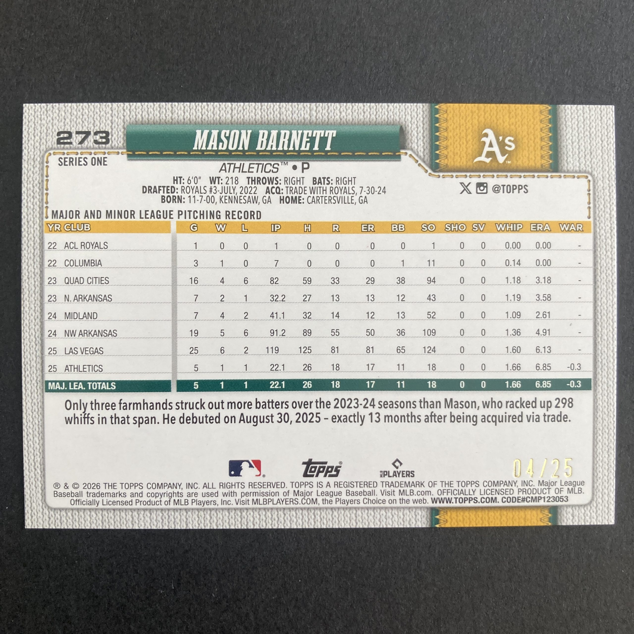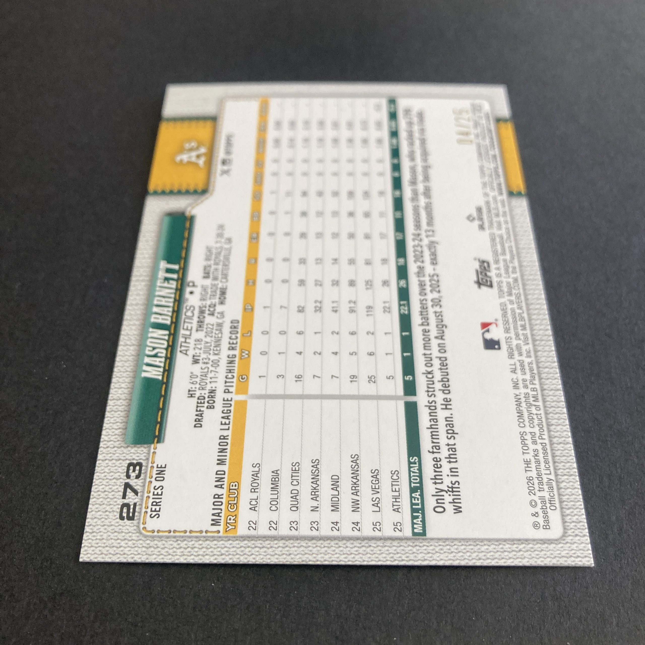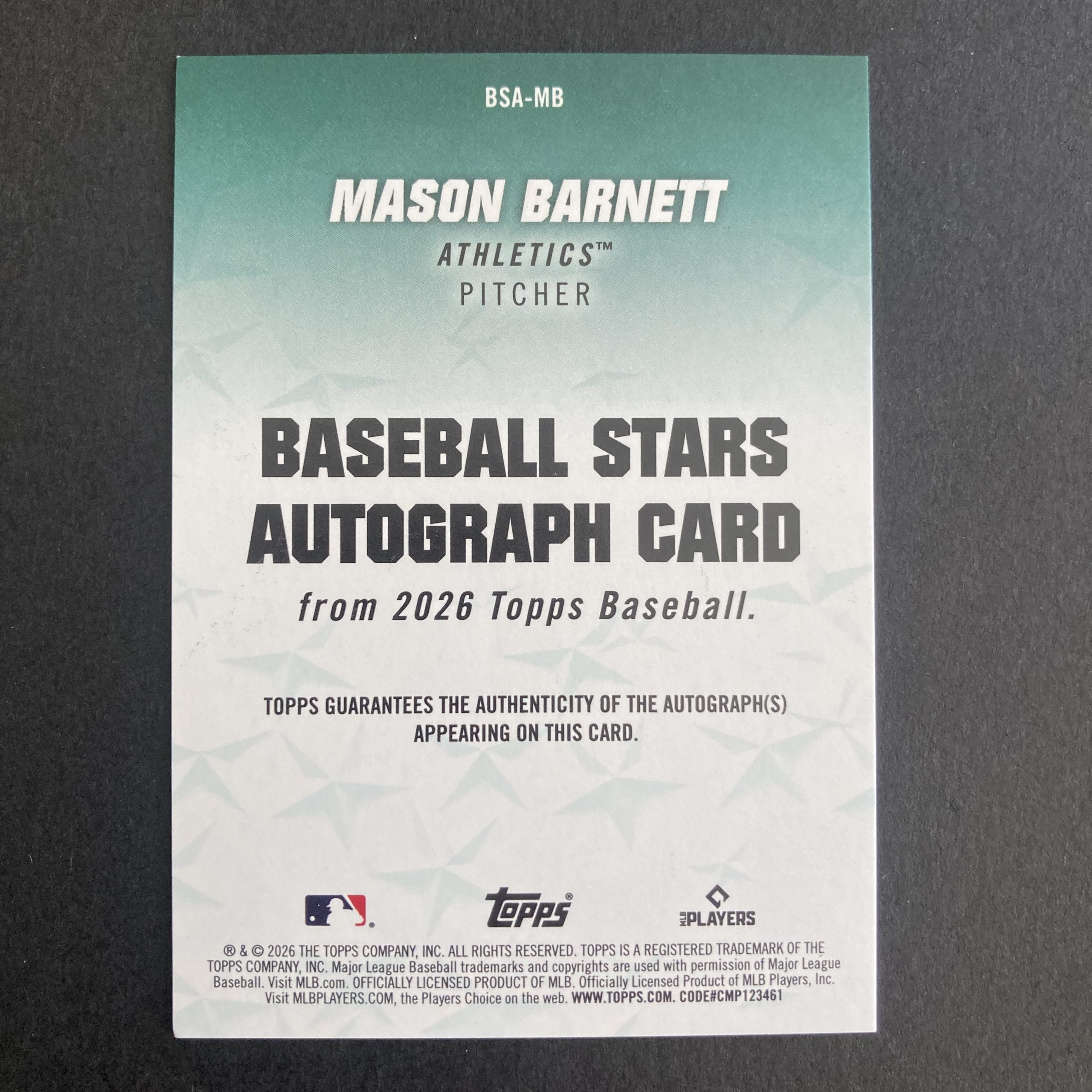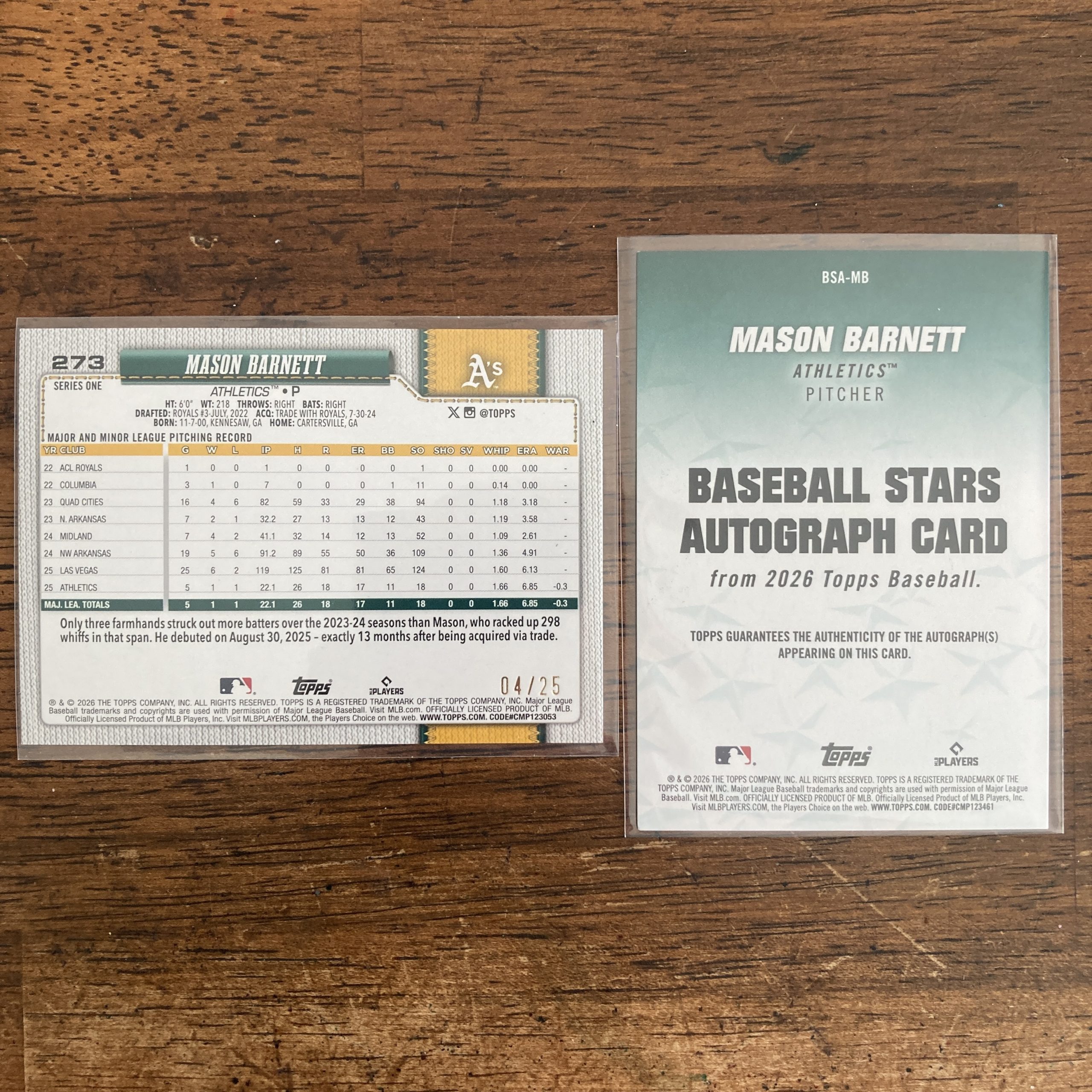 Curated pack of two different Mason Barnett baseball rookie cards from 2026 Topps Series 1 – an SSP Memorial Day Camo foil parallel RC #273 (serial numbered 04/25) and a Baseball Stars Autograph Card insert #BSA-MB. Nice little instant collection bundle of cards for a baseball fan! You will receive all of the exact cards pictured. Each card will be in a penny sleeve and top loader and they will come in a small pack (team bag) with cover graphic as pictured. Will be shipped very well protected!