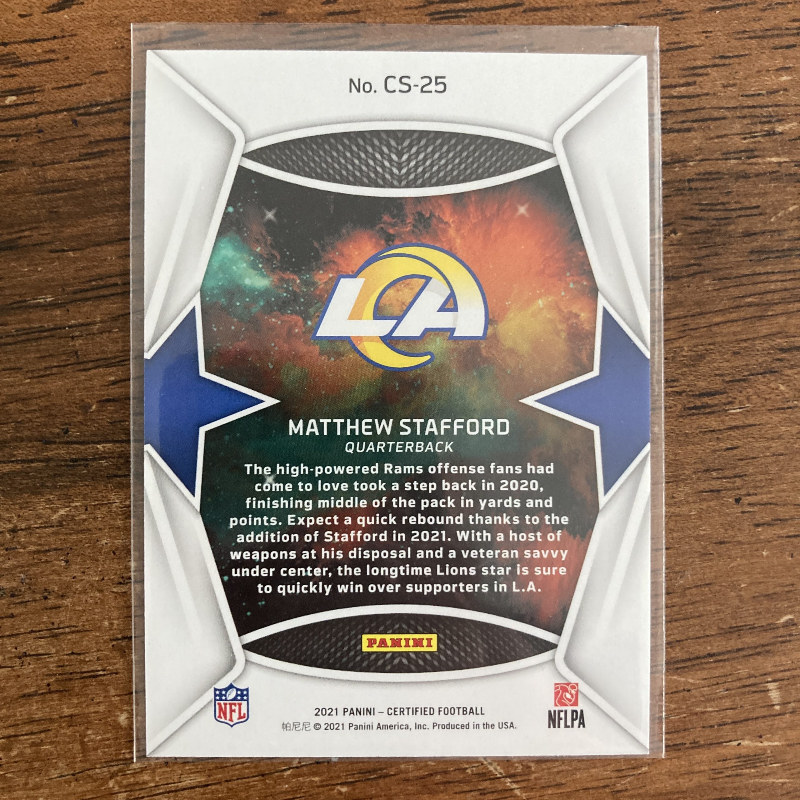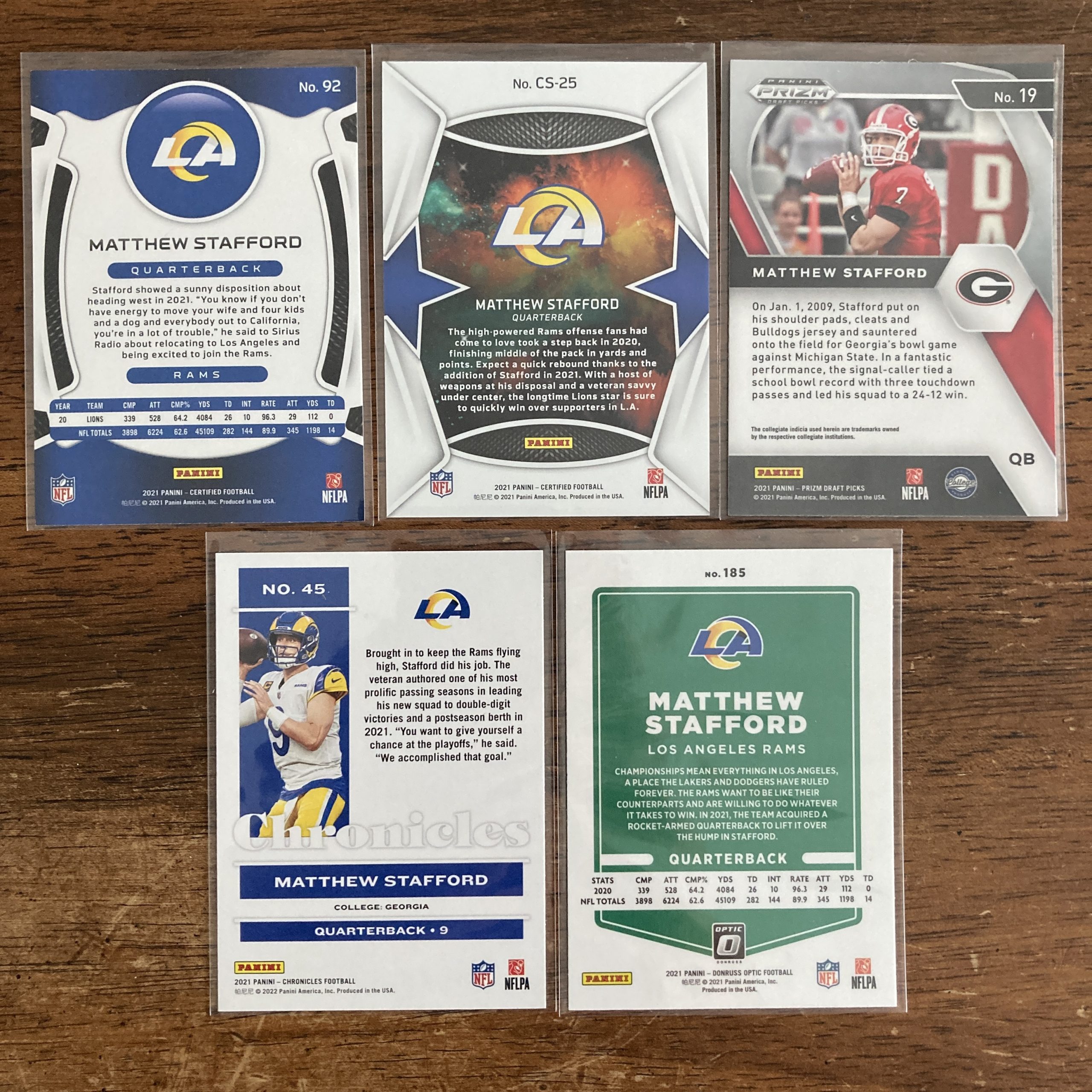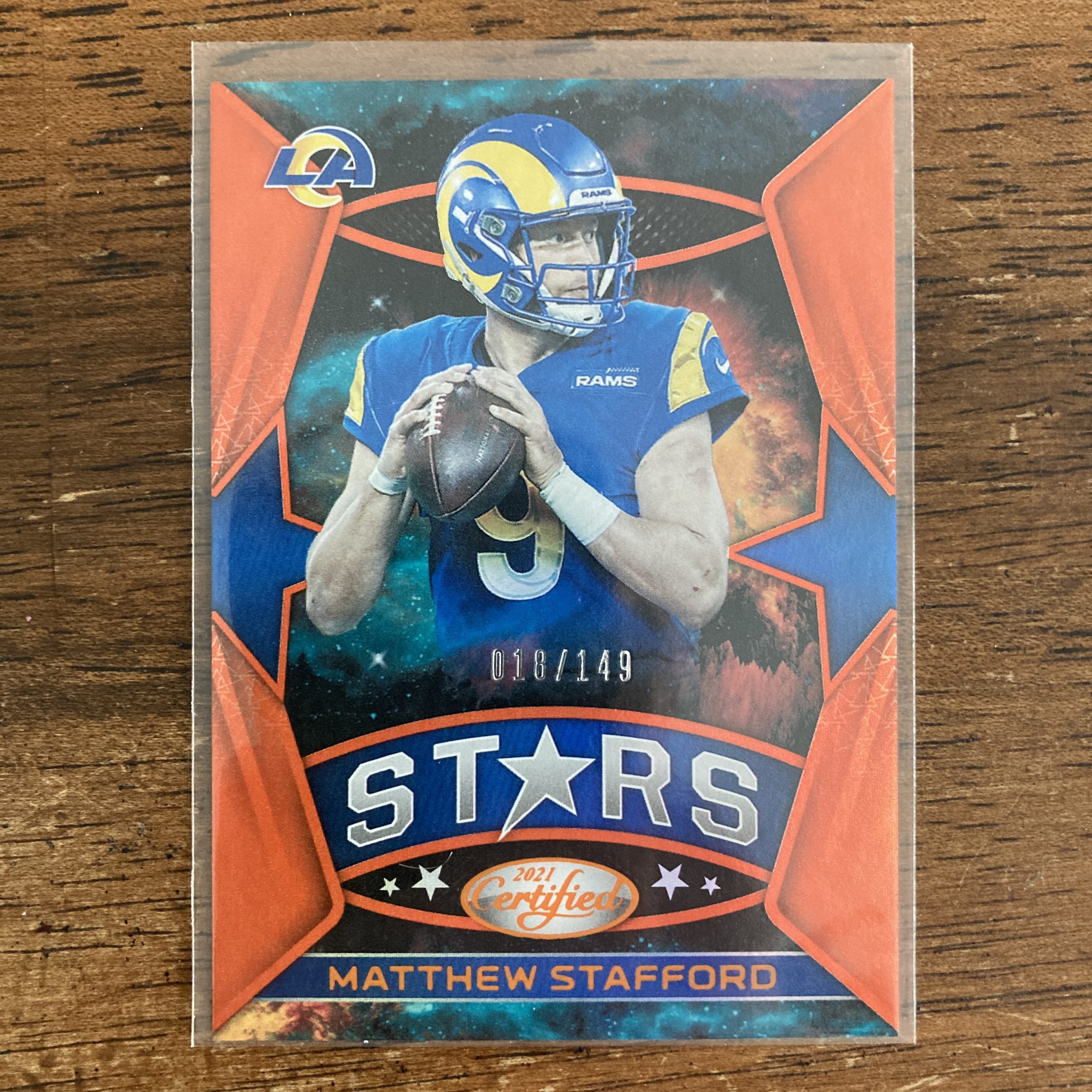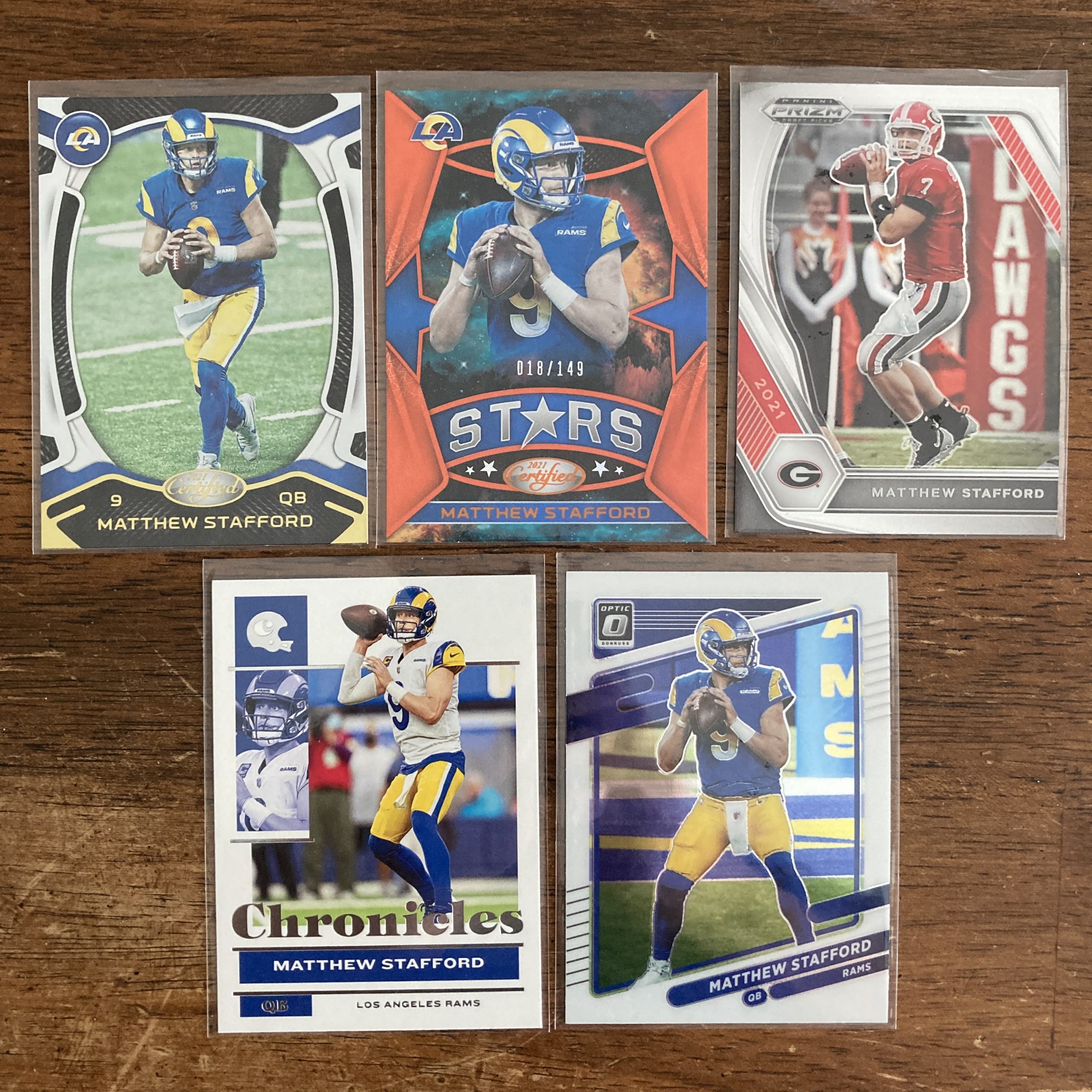 Curated pack of five different Matthew Stafford football cards including a Panini Certified Stars SP Mirror Orange holofoil parallel insert card, serial numbered 018/149. Great instant collection bundle of cards for a football fan! You will receive all of the exact cards pictured. Each card will be in a penny sleeve and top loader and they will come in a small pack (team bag) with cover graphic as pictured. Will be shipped very well protected!