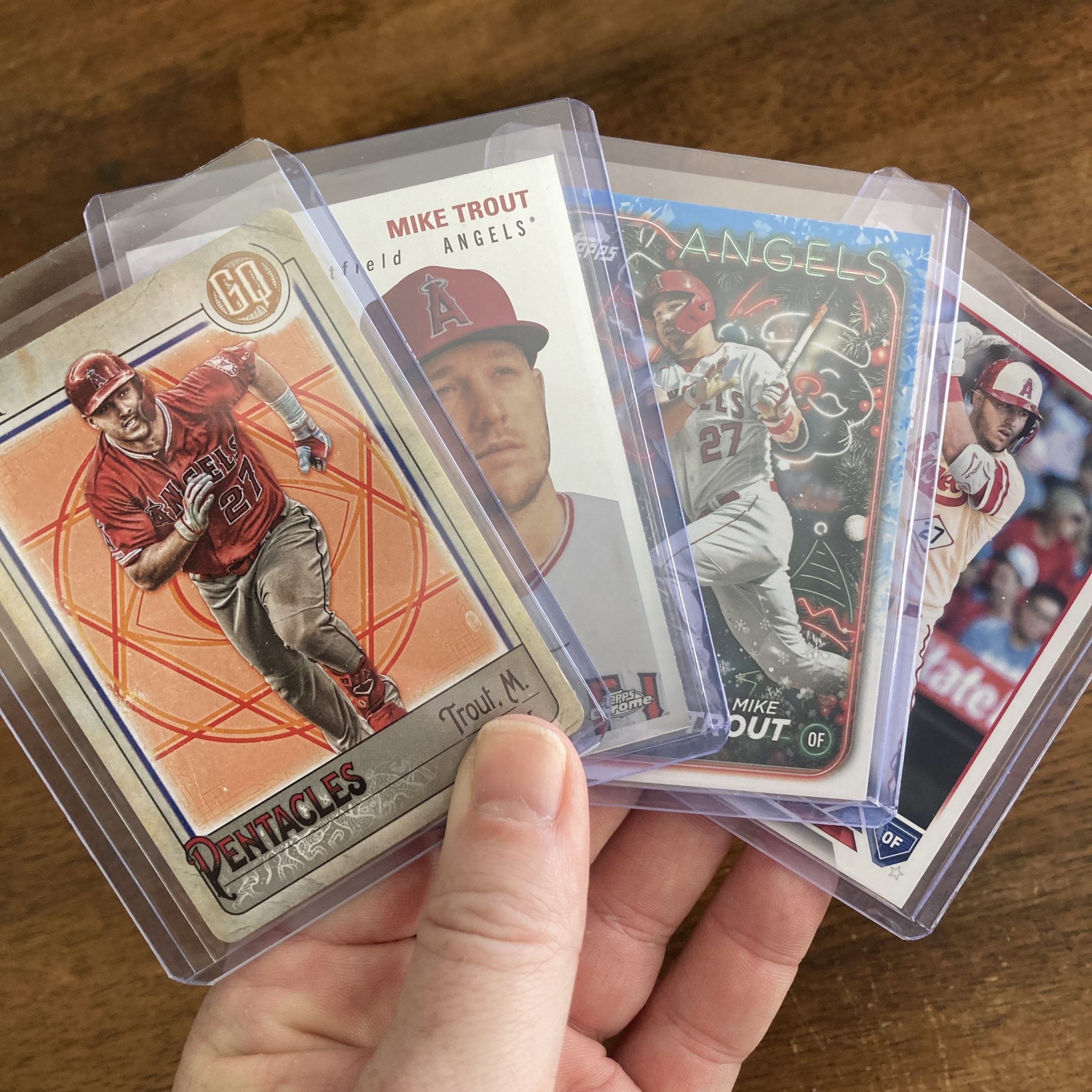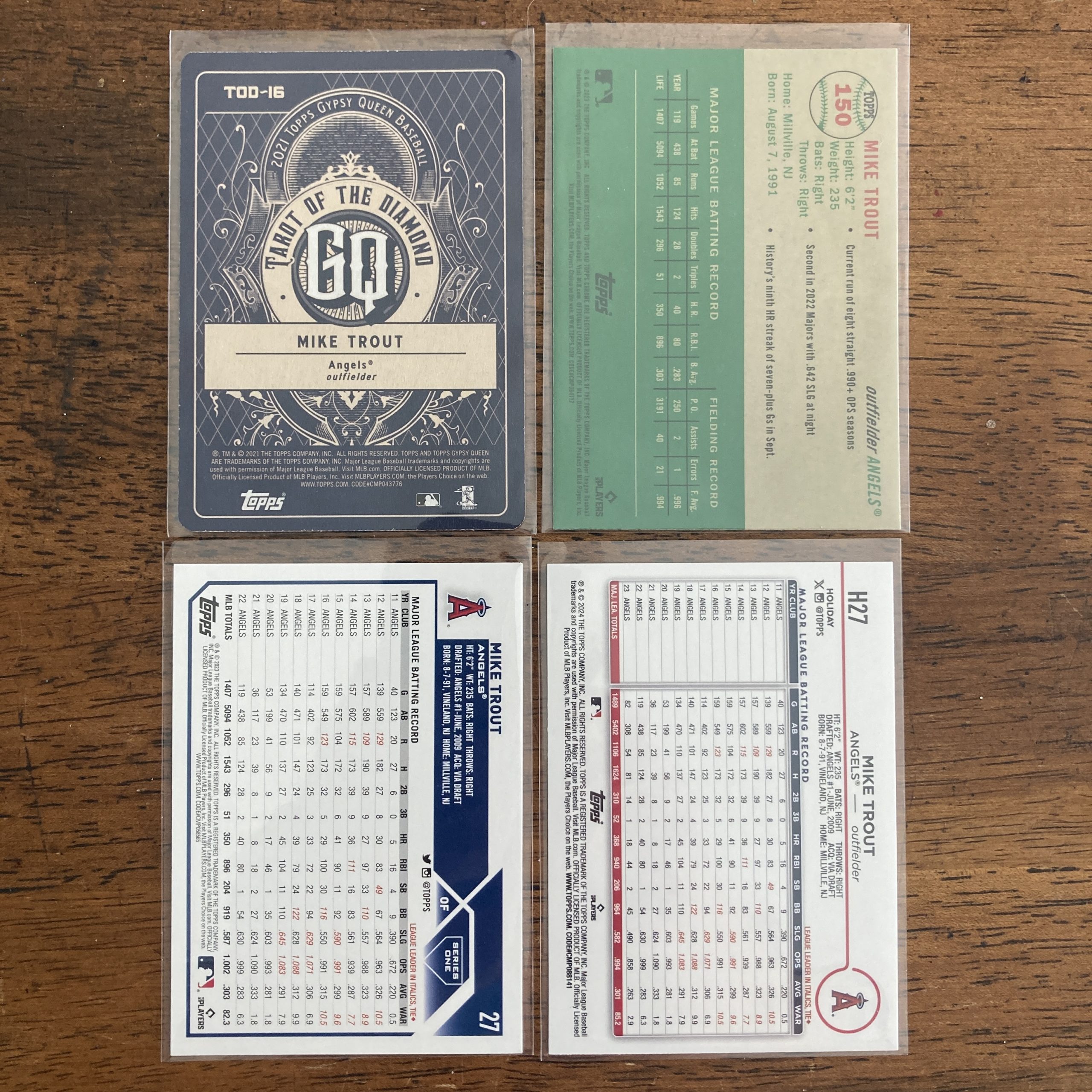 Curated pack of four different Mike Trout baseball cards including a Gypsy Queen insert card. Great instant collection bundle of cards for a baseball fan! You will receive all of the exact cards pictured. Each card will be in a penny sleeve and top loader and they will come in a small pack (team bag) with cover graphic as pictured. Will be shipped very well protected!