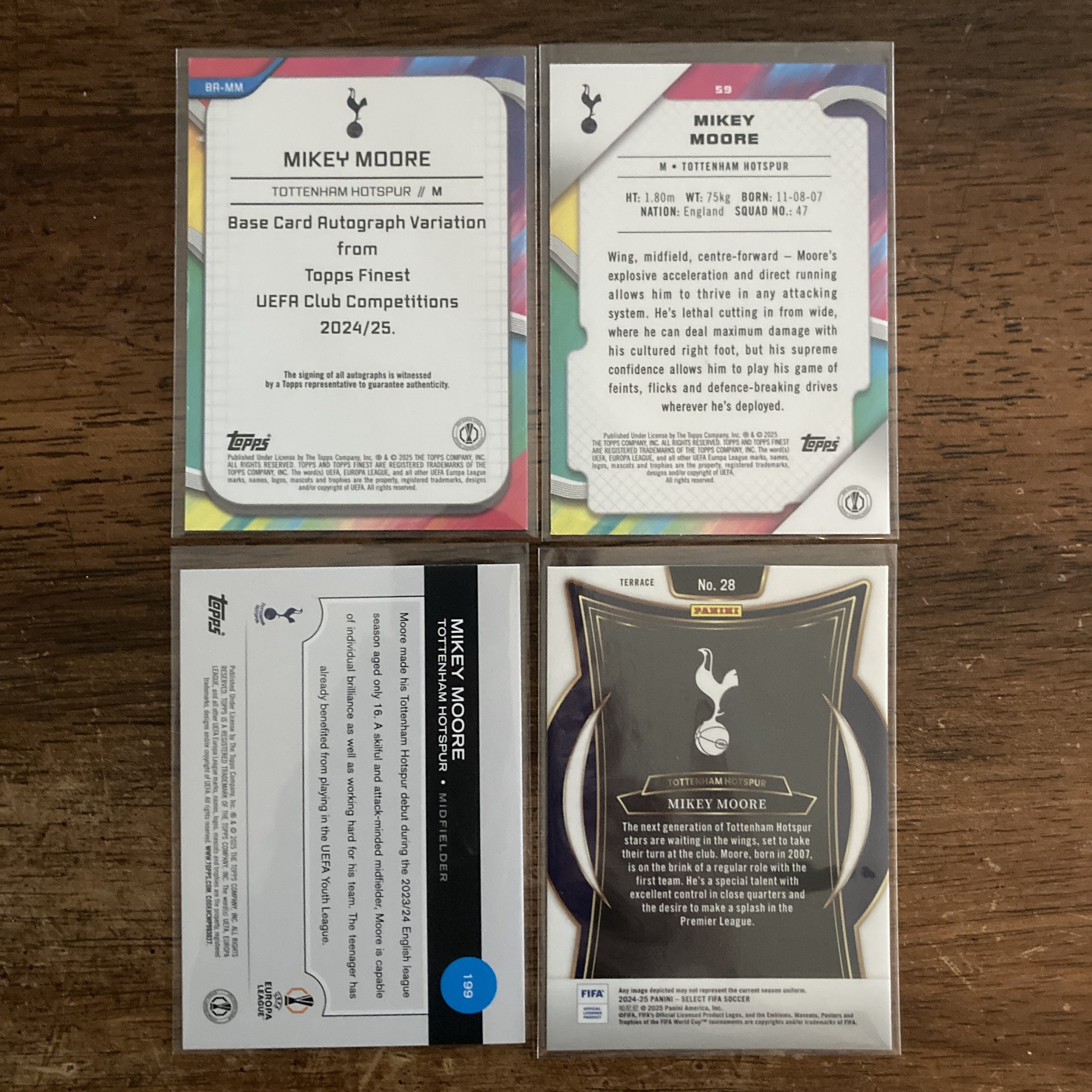 Curated pack of four different Mikey Moore soccer rookie cards including 2024-25 Topps Finest UEFA SSP Neon Green Refractor parallel (#’ed 04/99) autographed rookie card. Nice little instant collection bundle of cards for a soccer fan! You will receive all of the exact cards pictured. Each card will be in a penny sleeve and top loader and they will come in a small pack (team bag) with cover graphic as pictured. Will be shipped very well protected!