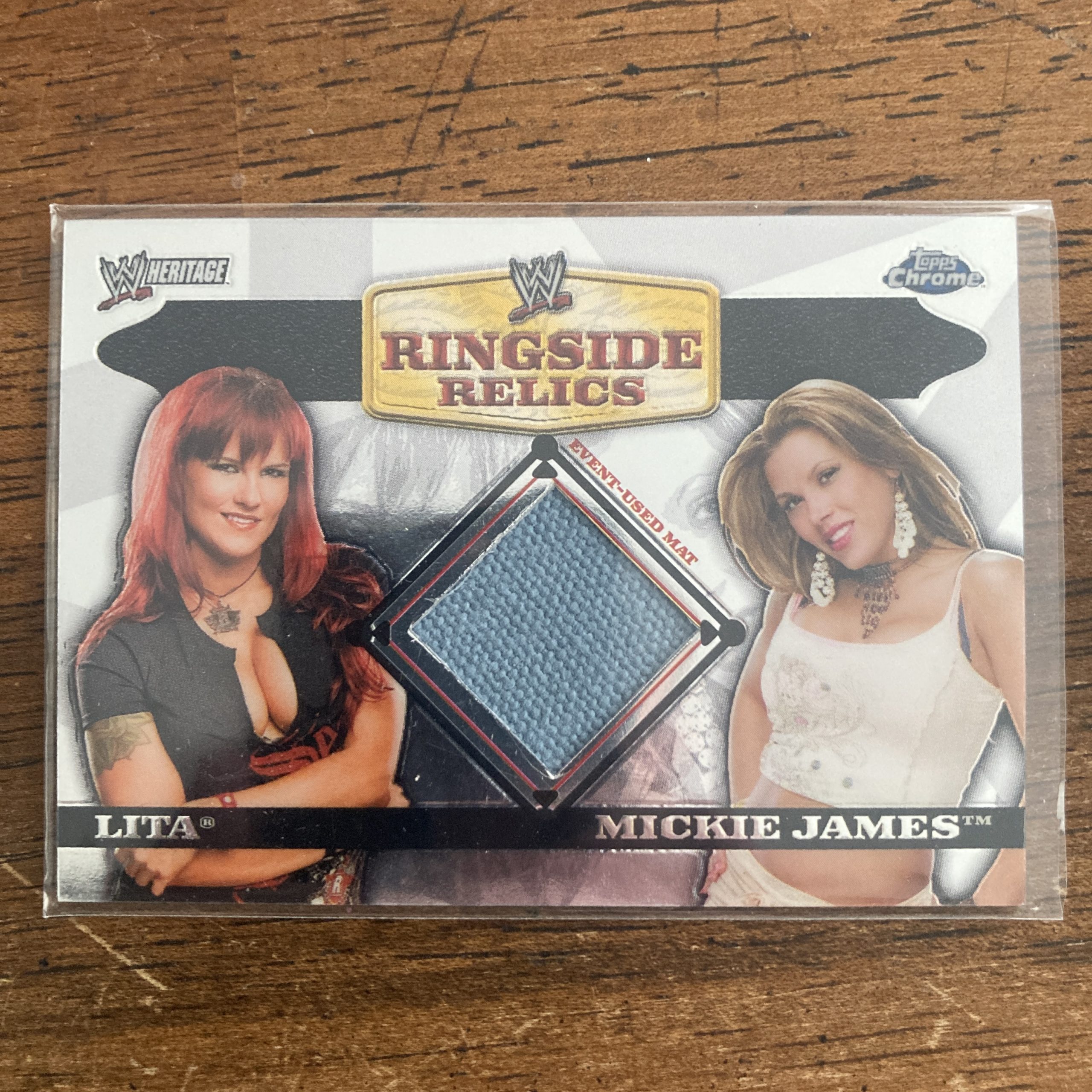 Curated pack of two different Topps Chrome Heritage “Ringside Relics” wrestling insert cards featuring Lita and Mickie James on one card and Kane and Umaga on the other. Each card contains an event-used mat piece from the Cyber Sunday 2006 event. Nice little instant collection bundle of cards for a wrestling fan! You will receive all of the exact cards pictured. Each card will be in a penny sleeve and top loader and they will come in a small pack (team bag) with cover graphic as pictured. Will be shipped very well protected!
