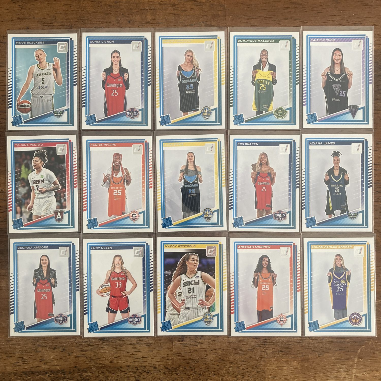 Curated packs with all 15 Rated Rookie cards from 2025 Panini Donruss WNBA (cards #86-#100) plus a bonus Caitlin Clark card! See below for list of players included. Nice instant collection bundle of cards for a basketball fan! You will receive all of the exact cards pictured. Each card will be in a penny sleeve and top loader and they will come in two packs (team bags) with cover graphic like the pack pictured. Will be shipped very well protected!