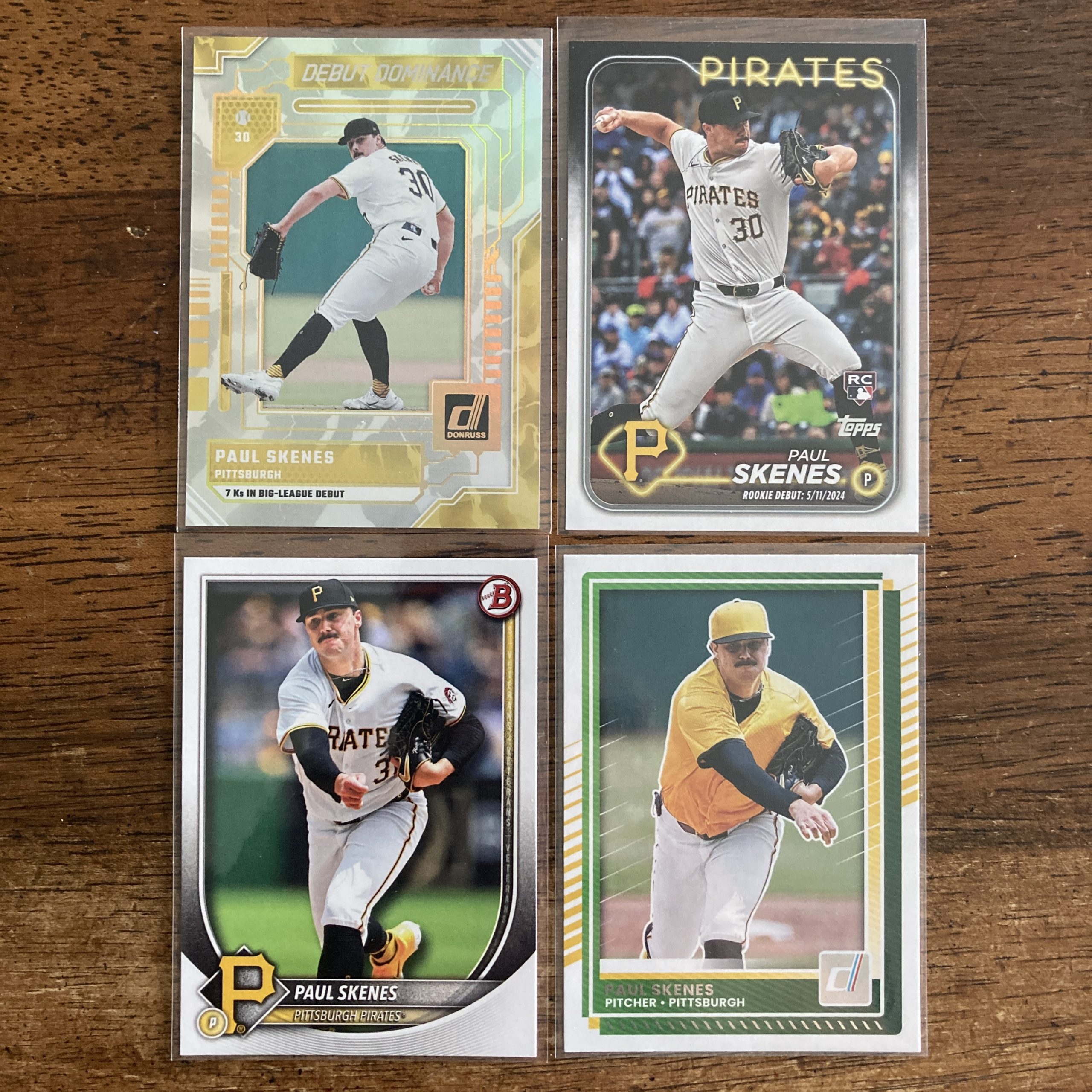 Curated pack of four different Paul Skenes baseball cards including Panini Donruss Debut Dominance holofoil insert and Topps Rookie Debut RC. Nice little instant collection of cards for a baseball fan! You will receive all of the exact cards pictured. Each card will be in a penny sleeve and top loader and they will come in a small pack (team bag) with cover graphic as pictured. Will be shipped very well protected!