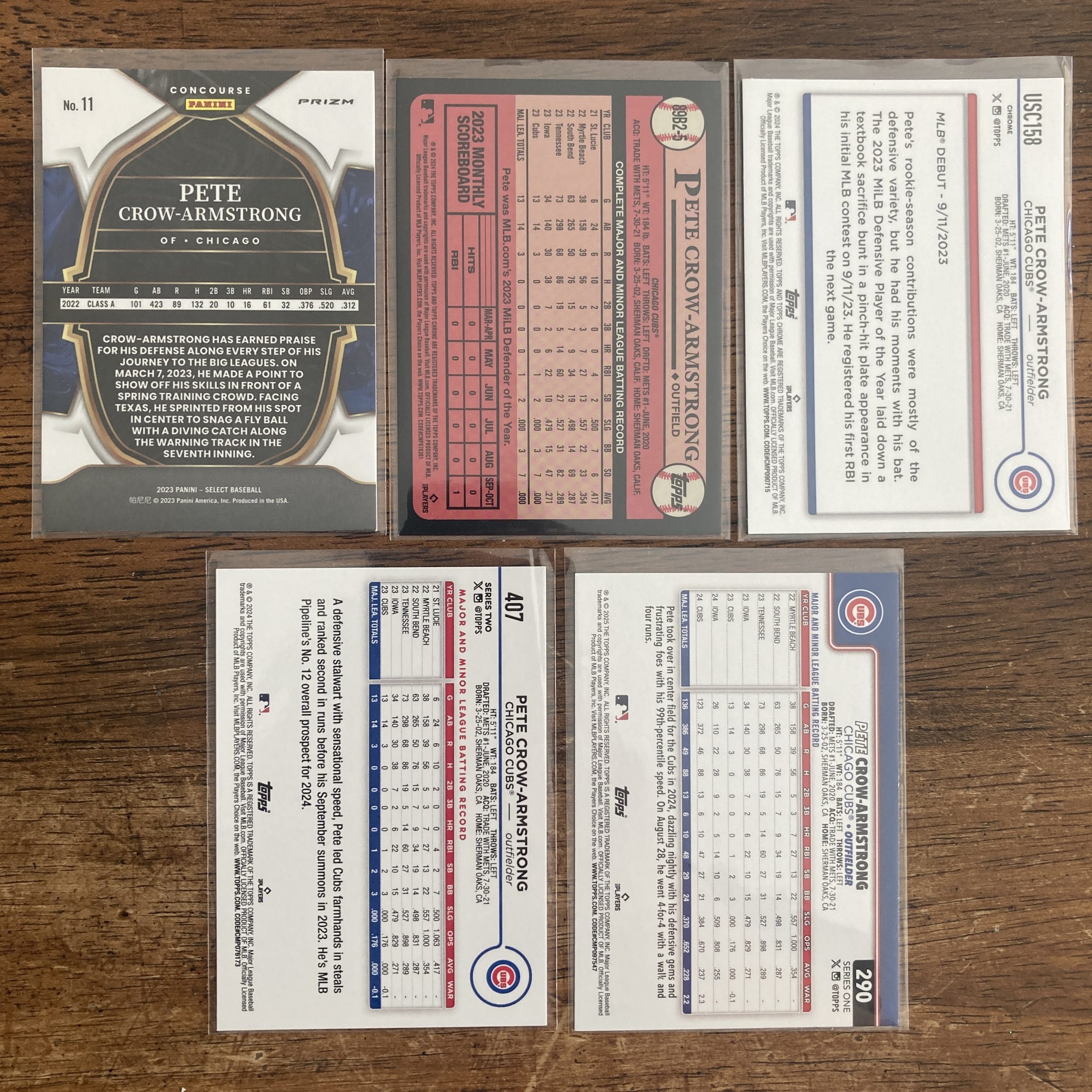 Curated pack of five different Pete Crow-Armstrong baseball cards including a Topps Series 2 1989 35th Anniversary SP Silver Crackle Foil parallel insert RC. Nice little instant collection bundle of cards for a baseball fan! You will receive all of the exact cards pictured. Each card will be in a penny sleeve and top loader and they will come in a small pack (team bag) with cover graphic as pictured. Will be shipped very well protected!