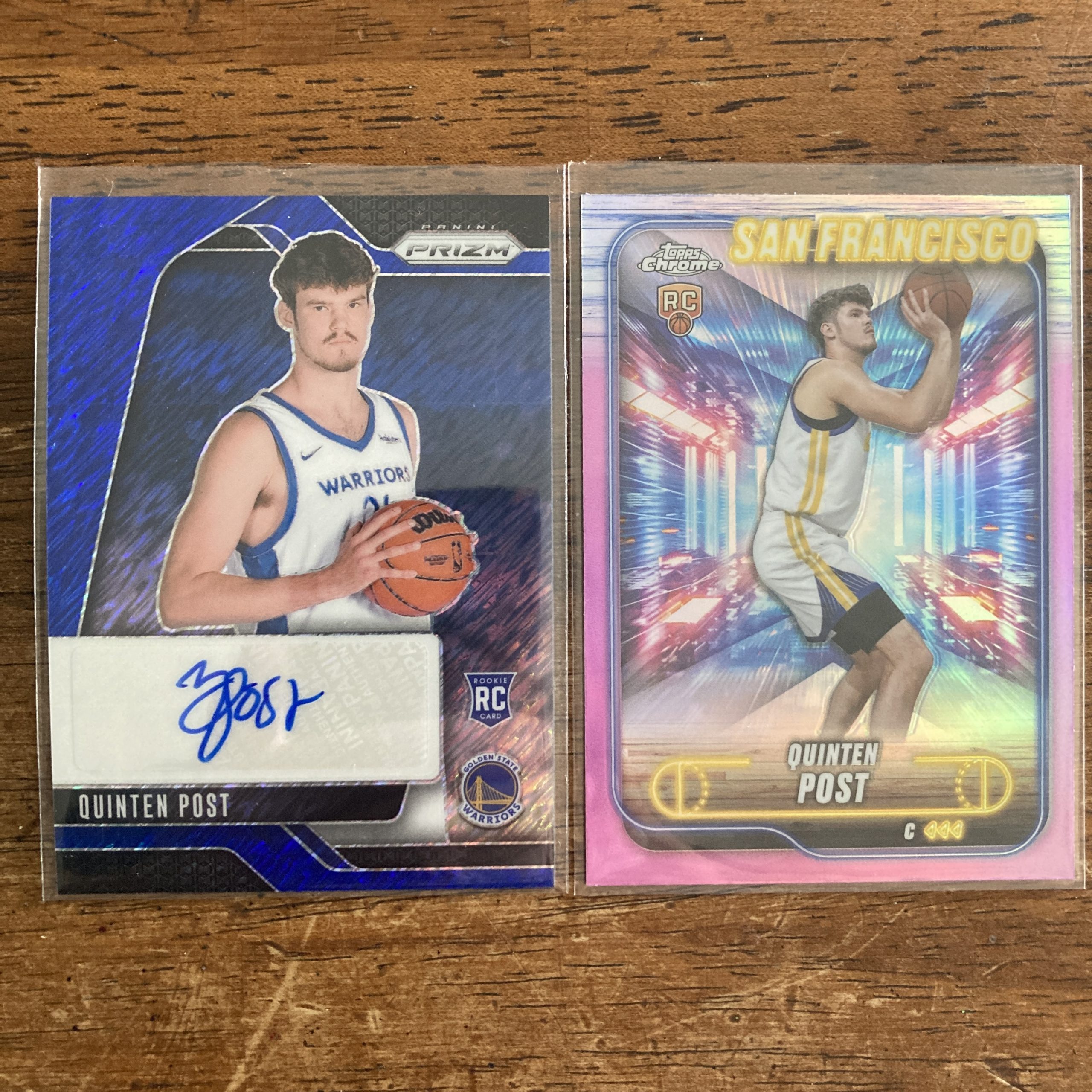Curated pack of two different Quinten Post basketball rookie cards including a Panini Prizm Rookie Signatures FOTL exclusive SSP Blue Shimmer Prizm (#’ed 20/25) parallel autographed insert rookie and a Topps Chrome SP Pink Refractor RC. Awesome team color match on the blue Prizm! Nice little instant collection bundle of cards for a basketball fan! You will receive all of the exact cards pictured. Each card will be in a penny sleeve and top loader and they will come in a small pack (team bag) with cover graphic as pictured. Will be shipped very well protected!