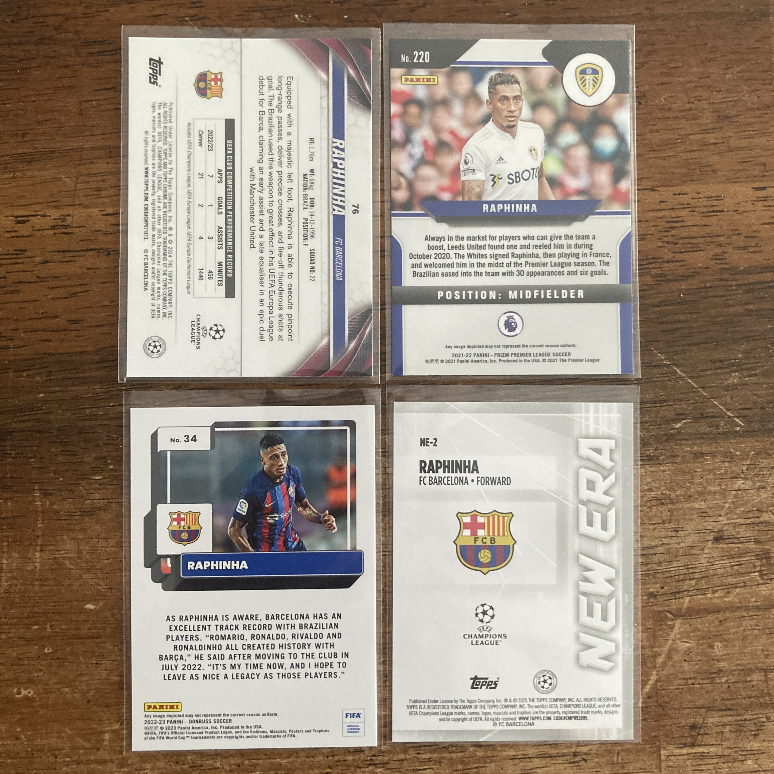 Curated pack of four different Raphinha soccer cards including a Topps Chrome SP Aqua Prism Refractor parallel card. Nice little instant collection bundle of cards for a soccer fan! You will receive all of the exact cards pictured. Each card will be in a penny sleeve and top loader and they will come in a small pack (team bag) with cover graphic as pictured. Will be shipped very well protected!