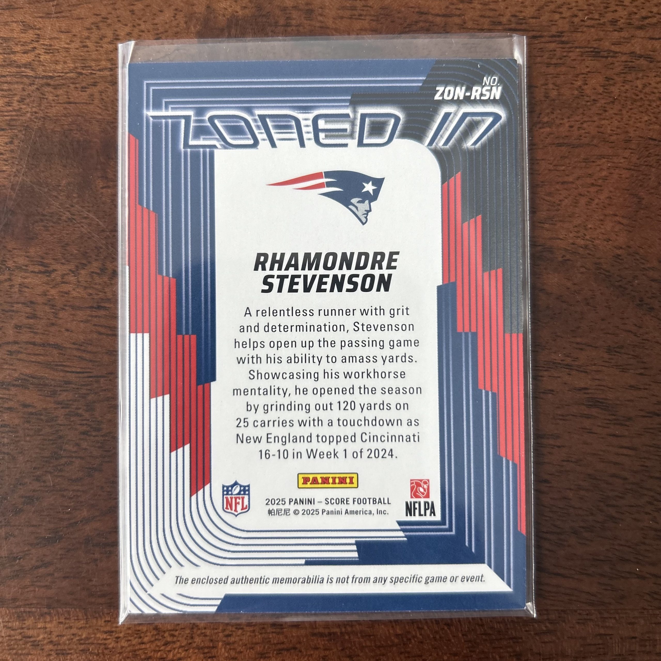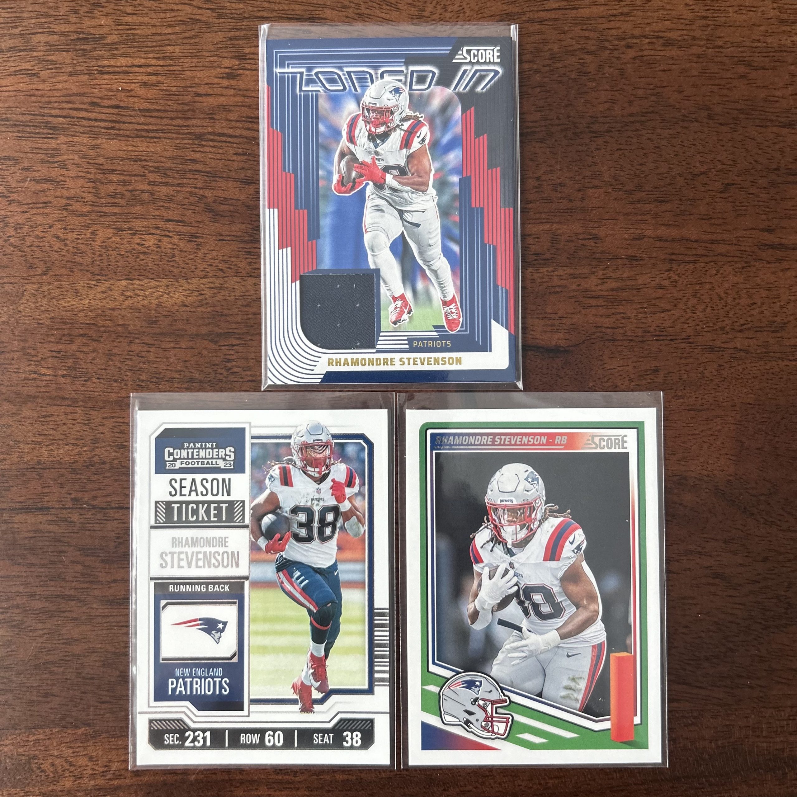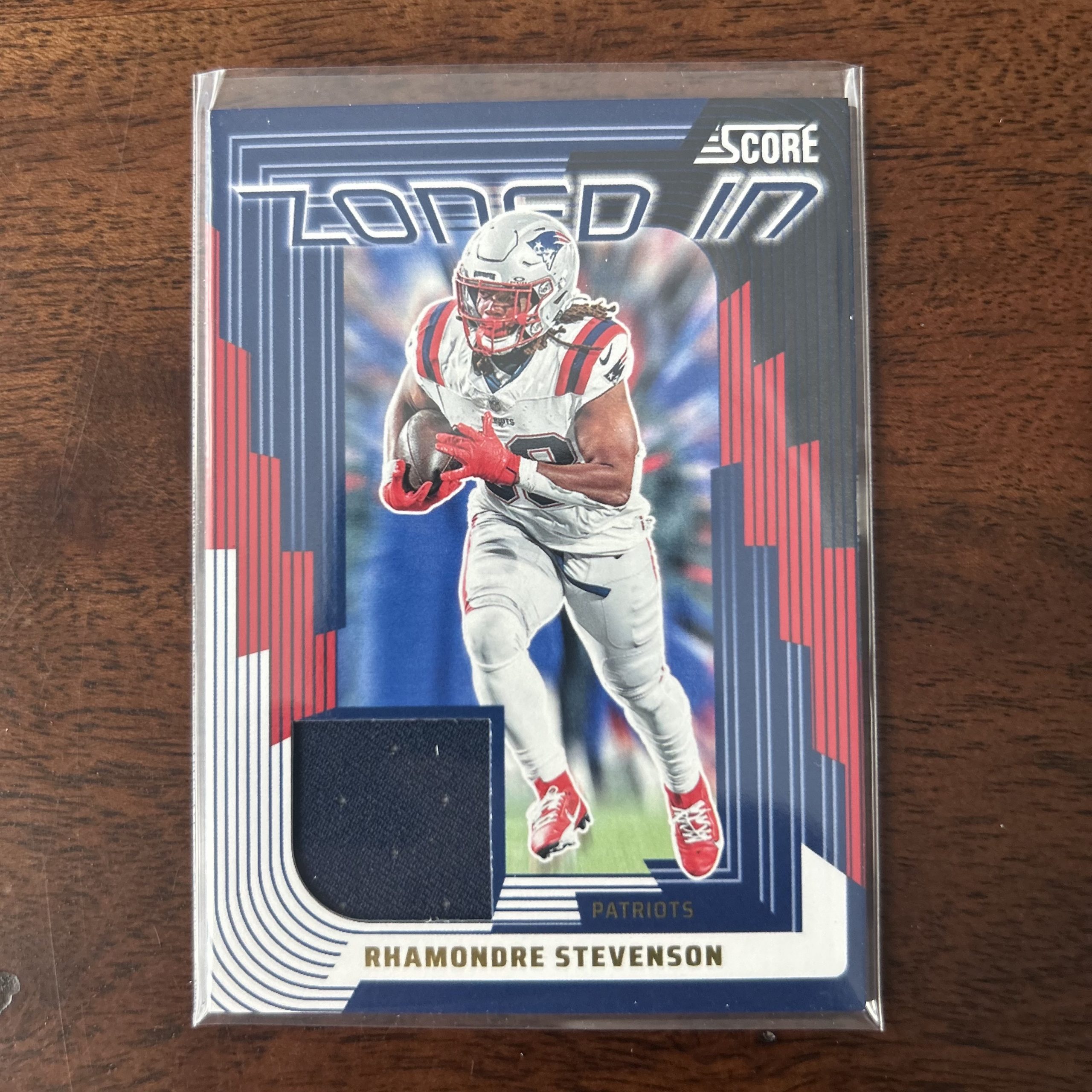 Tags: bundle, collection, contenders, Football, insert, jersey, lot, mem, memorabilia, New England, pack, panini, patch, Patriots, pats, relic, rhamondre stevenson, score, swatch, zoned in