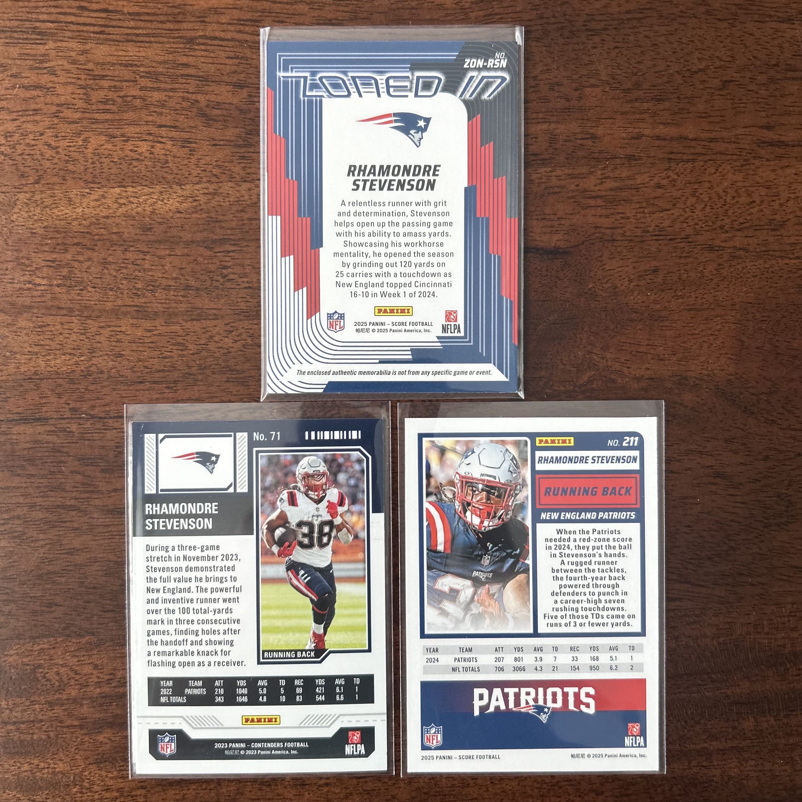 Curated pack of three different Rhamondre Stevenson football cards including a Score Zoned in mem patch insert card. Great instant collection bundle of cards for a football fan! You will receive all of the exact cards pictured. Each card will be in a penny sleeve and top loader and they will come in a small pack (team bag) with cover graphic as pictured. Will be shipped very well protected!