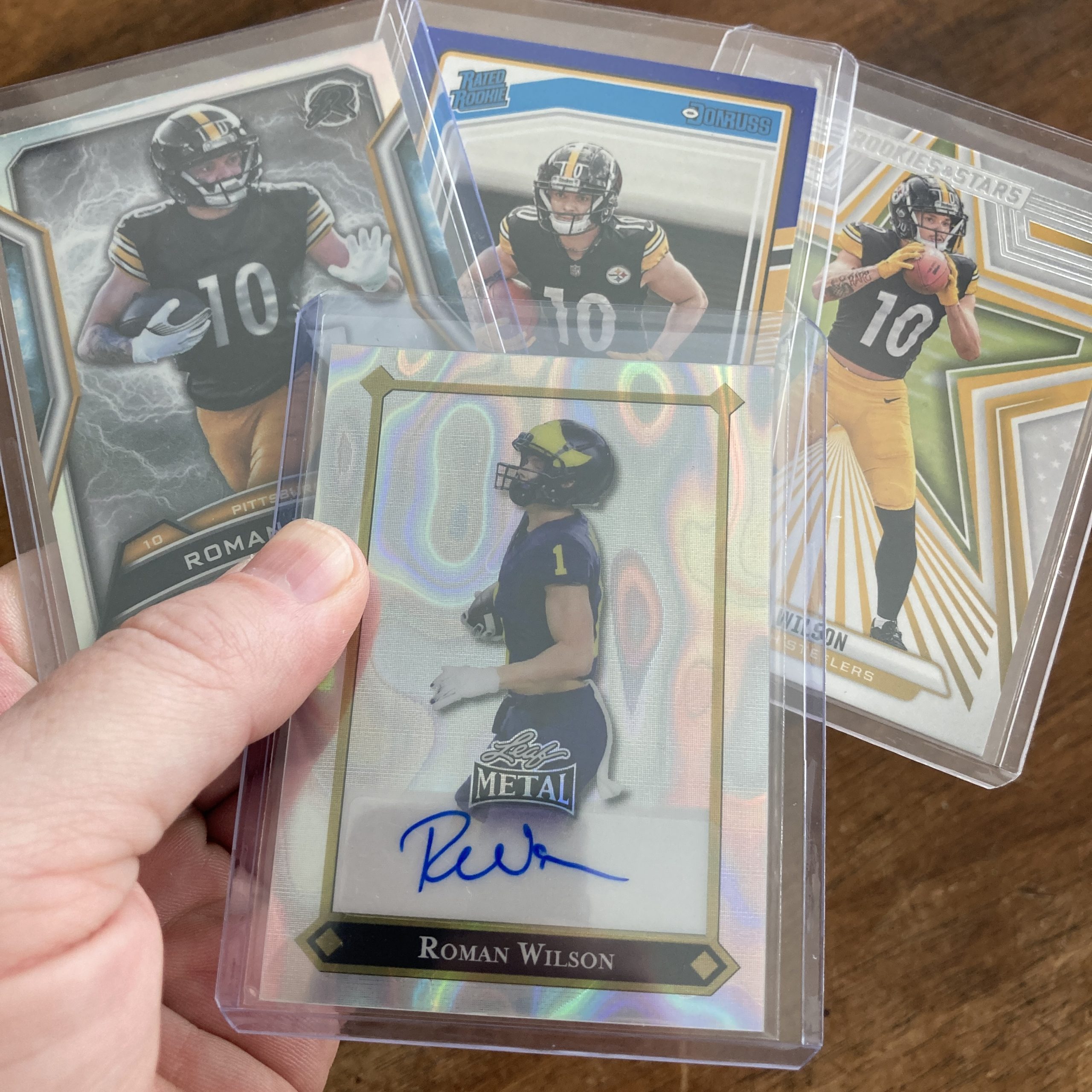 Tags: auto, autograph, autographed, blue press proof, bundle, collection, donruss, Football, leaf, lot, pack, panini, parallel, Pittsburgh, rated rookie, rc, refractor, resurgence, roman wilson, rookie, serial numbered, signature, signed, sp, ssp, Steelers, super short print, topps