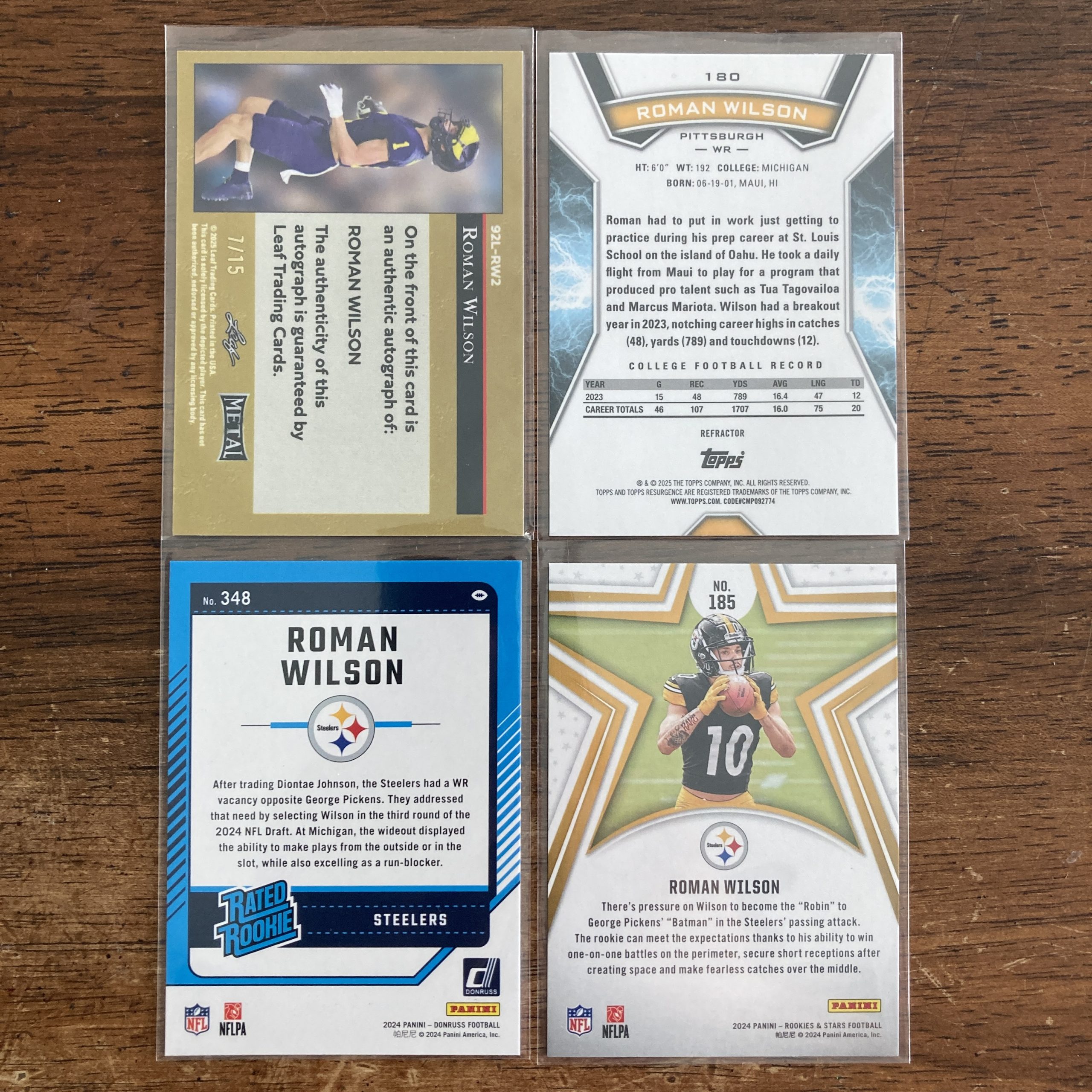 Curated pack of four different Roman Wilson football cards including a 2025 Leaf SSP (#’ed 7/15) autograph card, Topps Resurgence SP Refractor RC, Donruss Rated Rookie SP Blue Press Proof RC, and Panini Rookies & Stars RC. Nice little instant collection bundle of cards for a football fan! You will receive all of the exact cards pictured. Each card will be in a penny sleeve and top loader and they will come in a small pack (team bag) with cover graphic as pictured. Will be shipped very well protected!