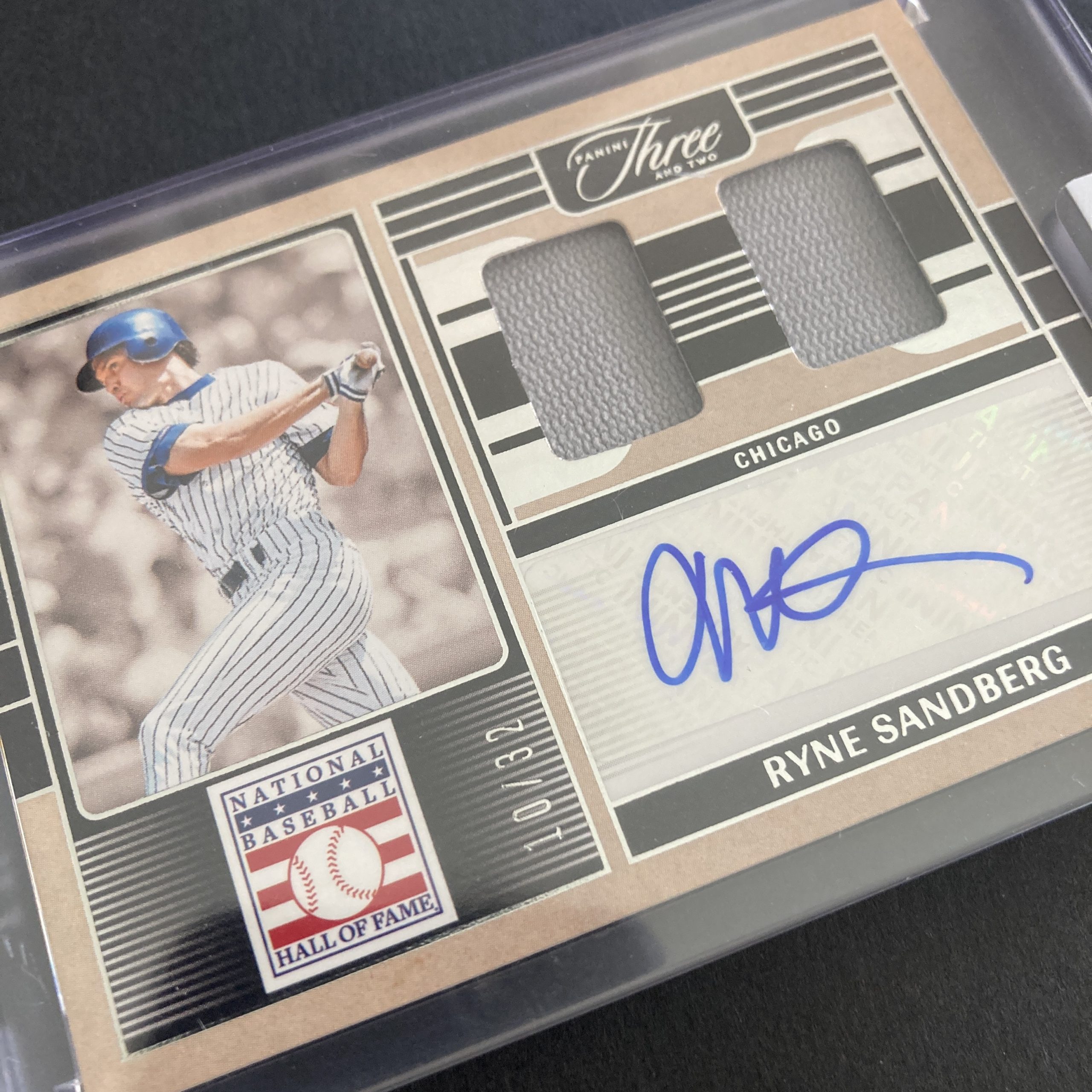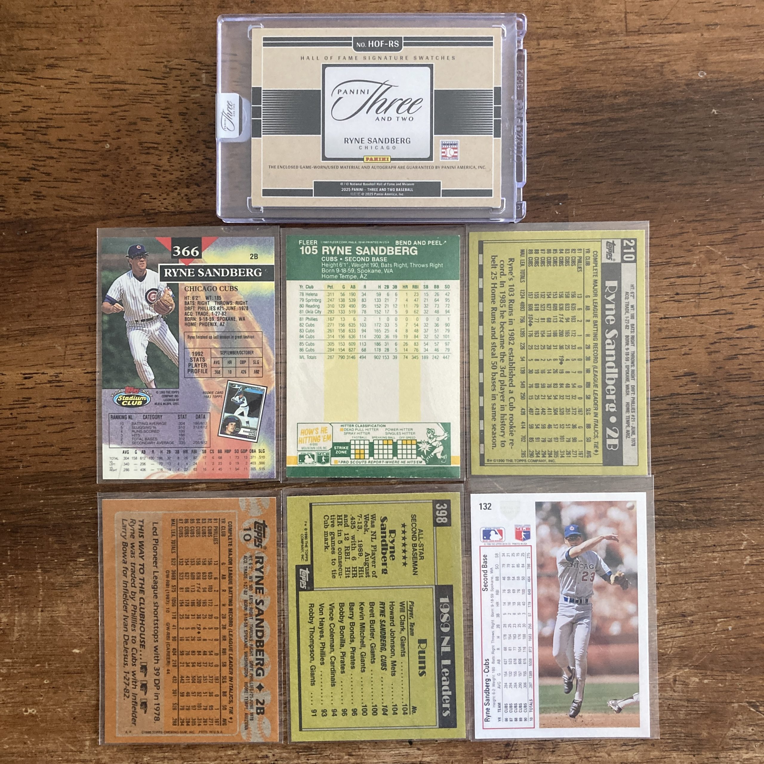 Curated pack of seven different Ryne Sandberg baseball cards including a 2025 Panini Three & Two SSP National Baseball Hall of Fame game worn/used jersey relic auto insert card, serial numbered 10/32, and six vintage 1980s-1990s cards. Nice little instant collection bundle of cards for a baseball fan! You will receive all of the exact cards pictured. The vintage cards are genuine and from my collection and may have minor imperfections such as small bumped corners/edges, but they do NOT have major damage such creases, significant wear, etc. Each card will be in a penny sleeve and top loader and they will come in a small pack (team bag) with cover graphic as pictured. Will be shipped very well protected!
