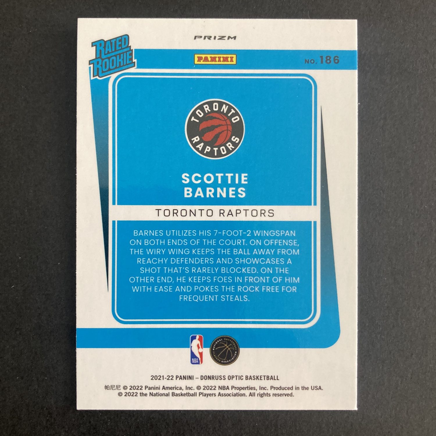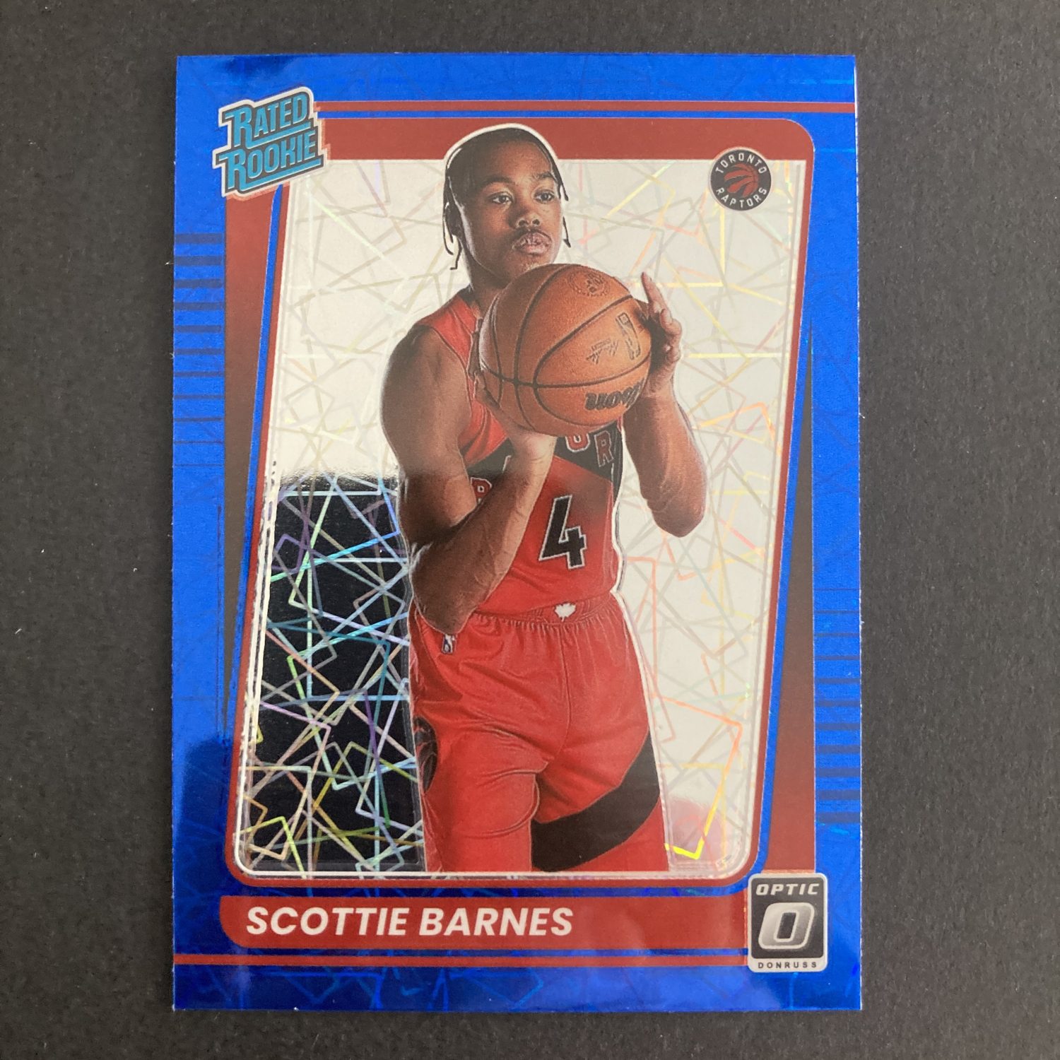 Curated pack of five different Scottie Barnes basketball cards including a Panini Donruss Optic Rated Rookie Blue Velocity Prizm parallel rookie card and a Select Blue Cracked Ice Prizm parallel card. Nice little instant collection bundle of cards for a basketball fan! You will receive all of the exact cards pictured. Each card will be in a penny sleeve and top loader and they will come in a small pack (team bag) with cover graphic as pictured. Will be shipped very well protected!
