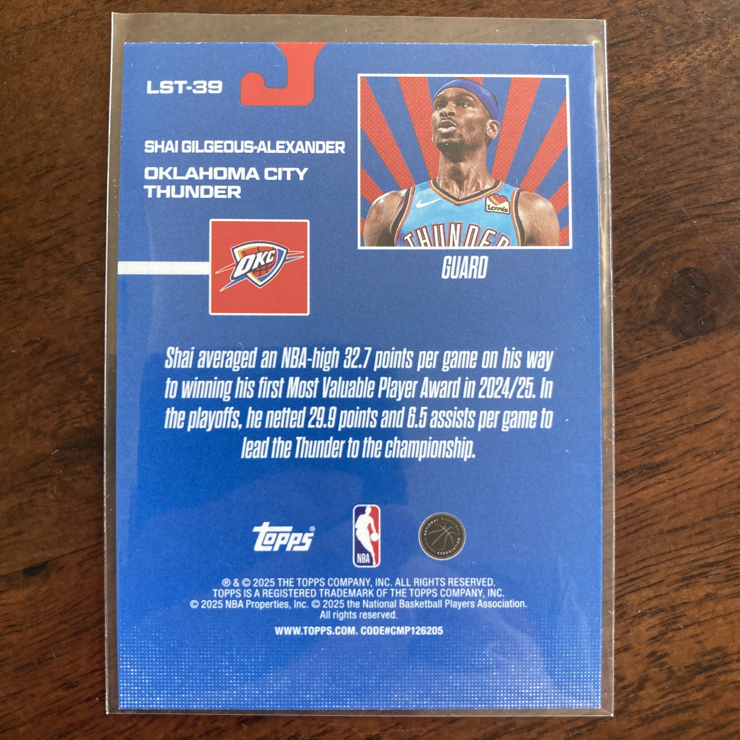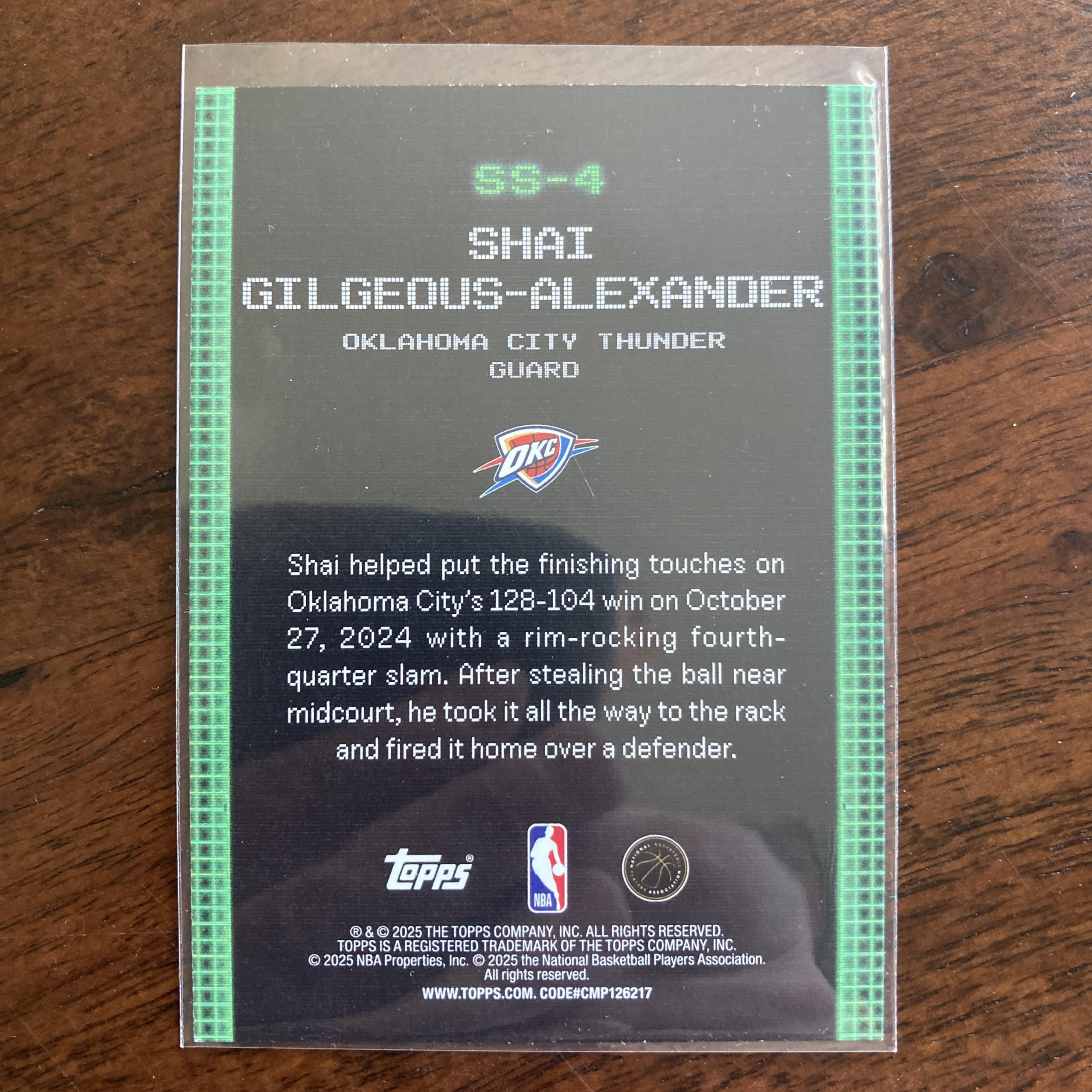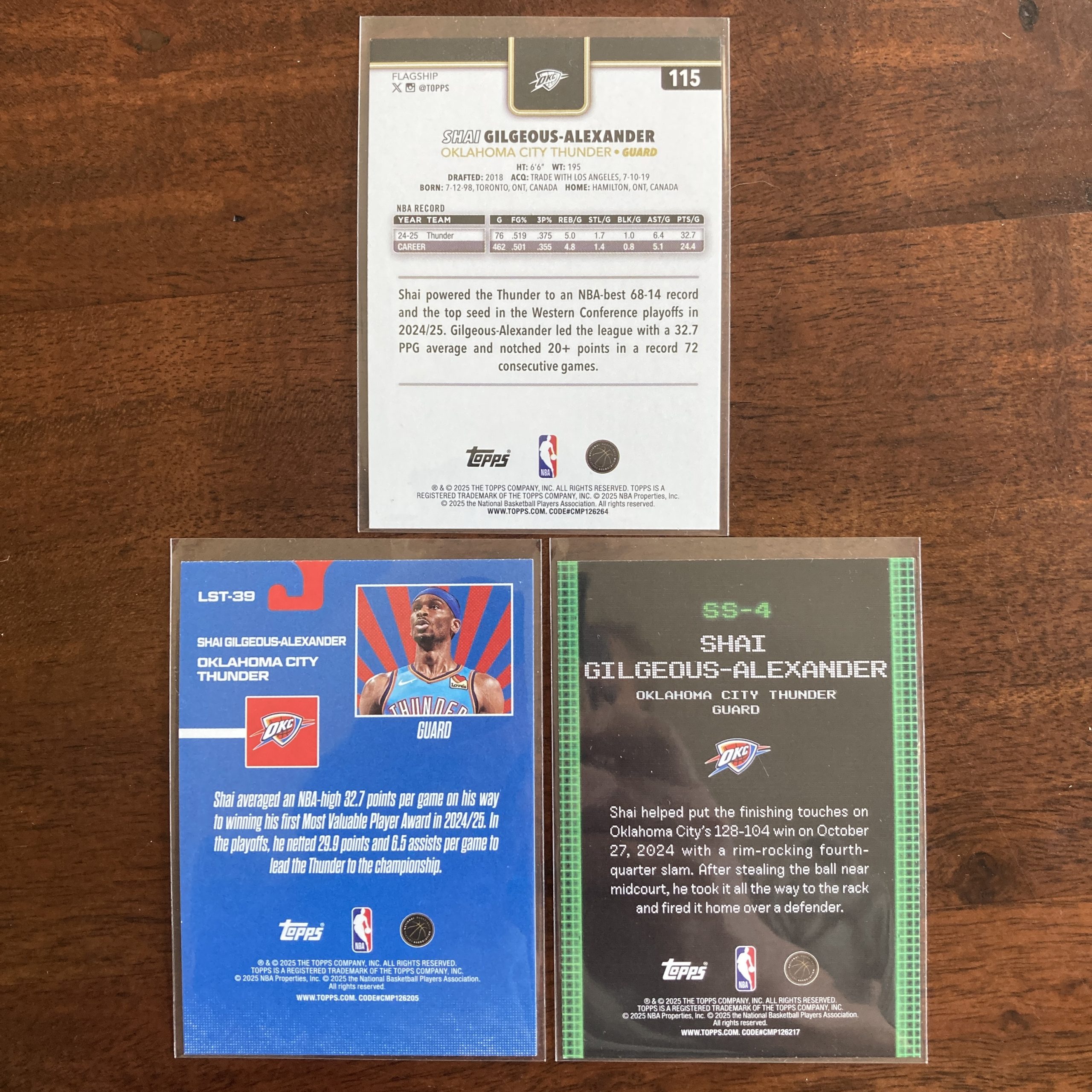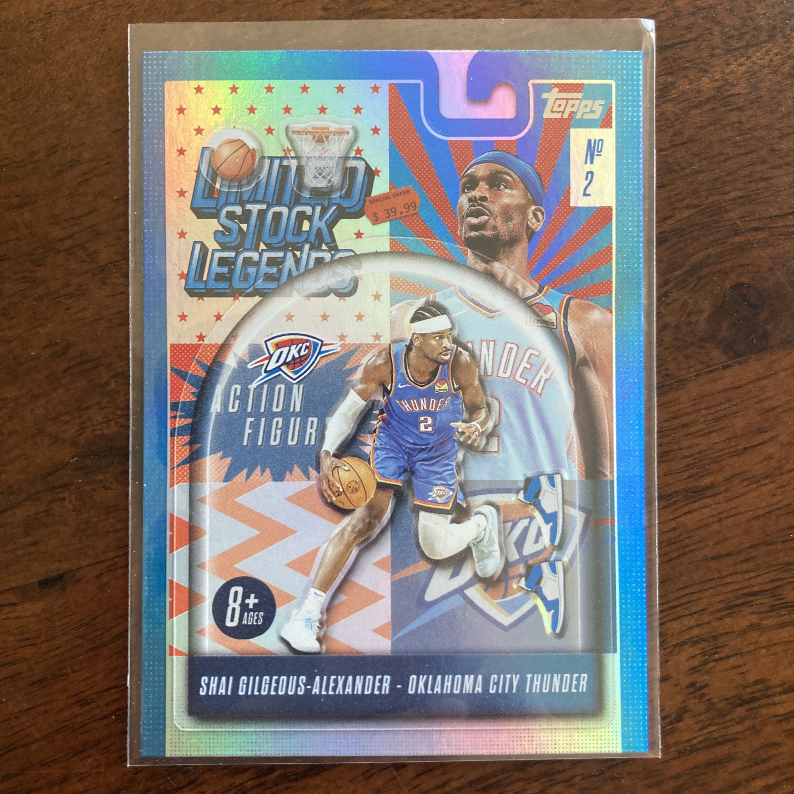 Curated pack of three different Shai Gilgeous-Alexander basketball cards from 2025-26 Topps Target-exclusive, limited edition Blackout Black Friday release – SP Blackout holofoil parallel card, SP Limited Stock Legends holofoil insert, and SP Scan & Slam holofoil insert. Nice little instant collection bundle lot of cards for a basketball fan! You will receive all of the exact cards pictured. Each card will be in a penny sleeve and top loader and they will come in a small pack (team bag) with cover graphic as pictured. Will be shipped very well protected!
