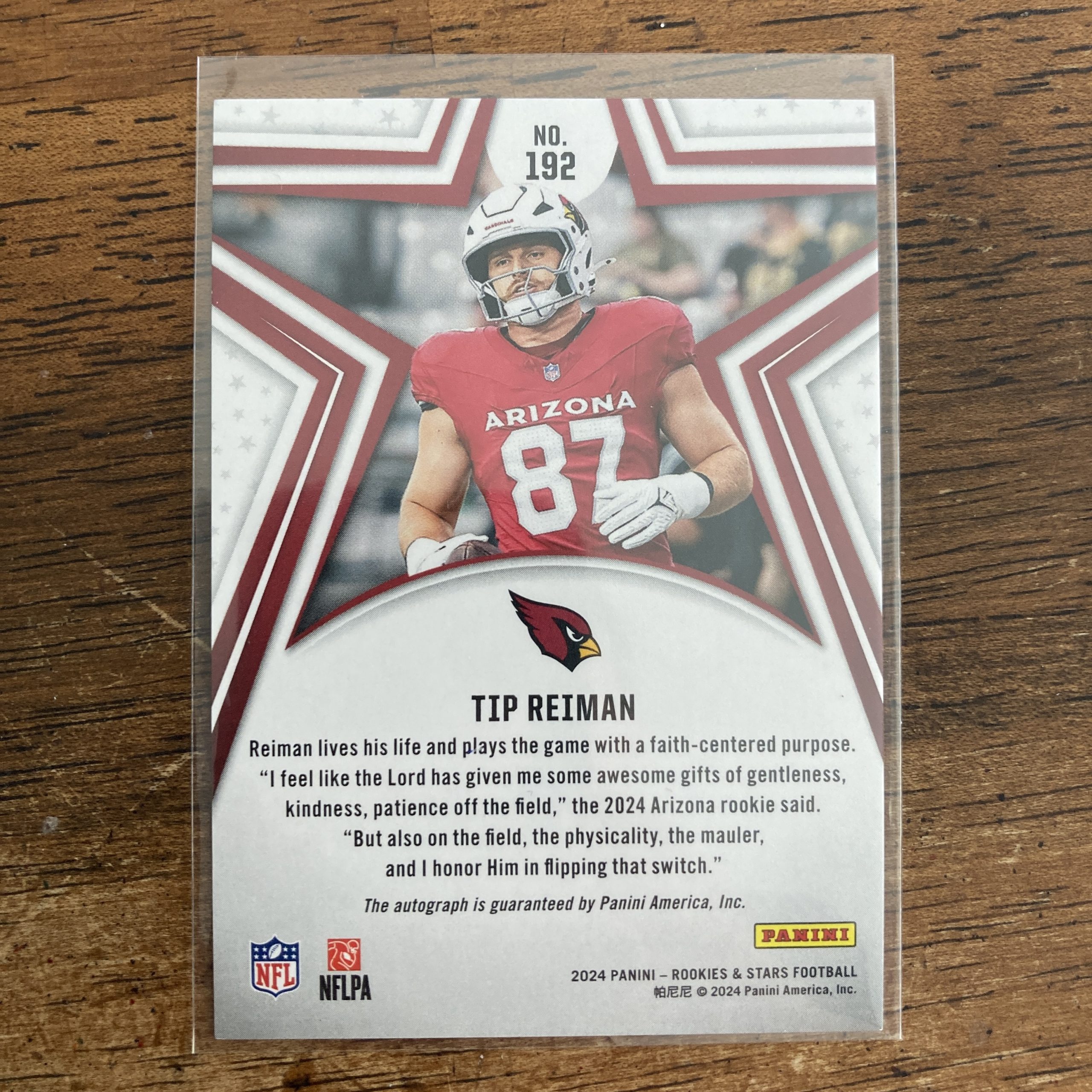 Curated pack of four different Tip Reiman football rookie cards including Panini Rookies & Stars auto RC (#’ed 234/499), Prizm SP Orange Disco Prizm RC, and Donruss SP Blue Press Proof Rated Rookie, and Absolute foil RC. Nice little instant collection bundle of cards for a football fan! You will receive all of the exact cards pictured. Each card will be in a penny sleeve and top loader and they will come in a small pack (team bag) with cover graphic as pictured. Will be shipped very well protected!
