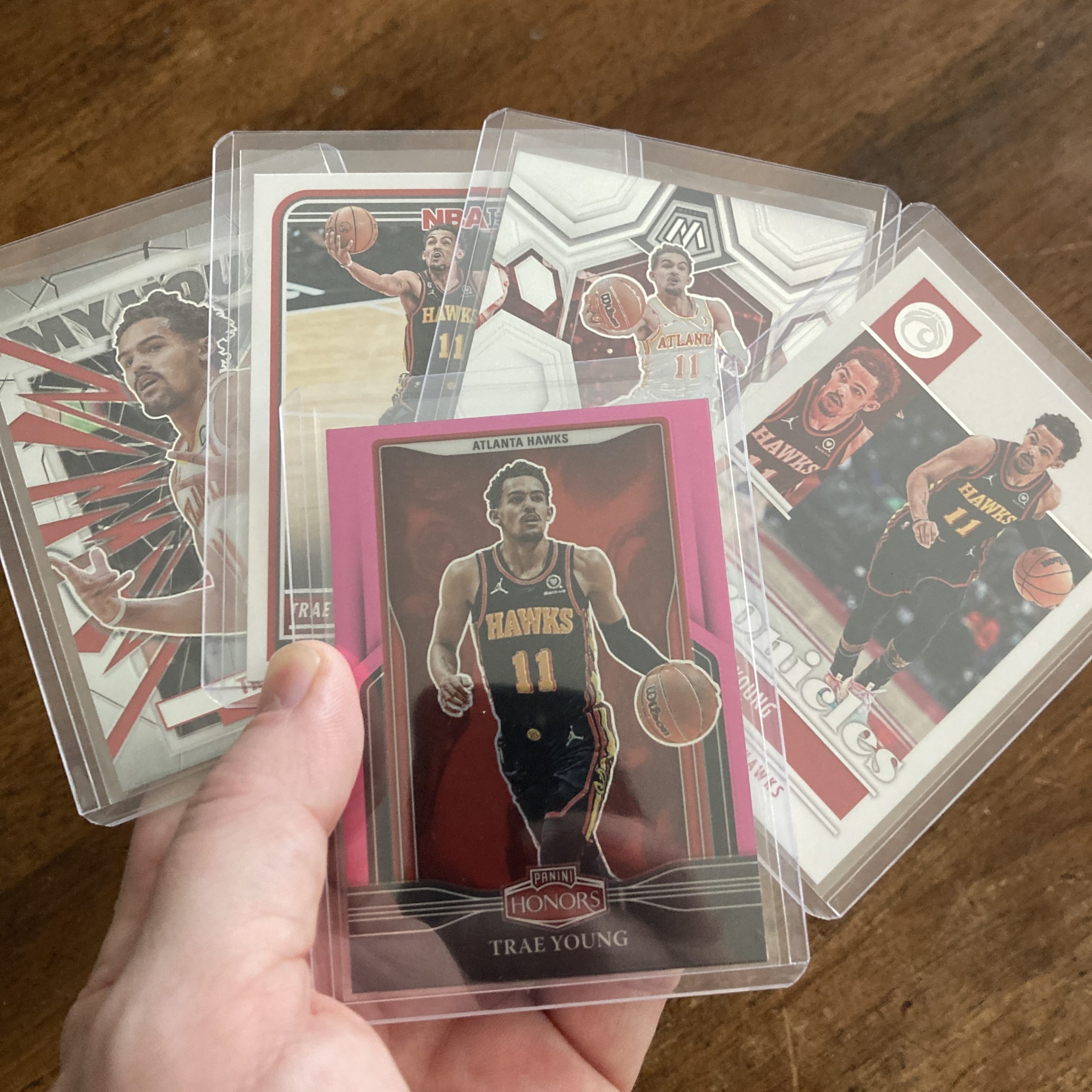 Curated pack of five different Trae Young basketball cards including a Panini Chronicles Honors SP Pink Prizm parallel card. Nice little instant collection bundle of cards for a basketball fan! You will receive all of the exact cards pictured. Each card will be in a penny sleeve and top loader and they will come in a small pack (team bag) with cover graphic as pictured. Will be shipped very well protected!