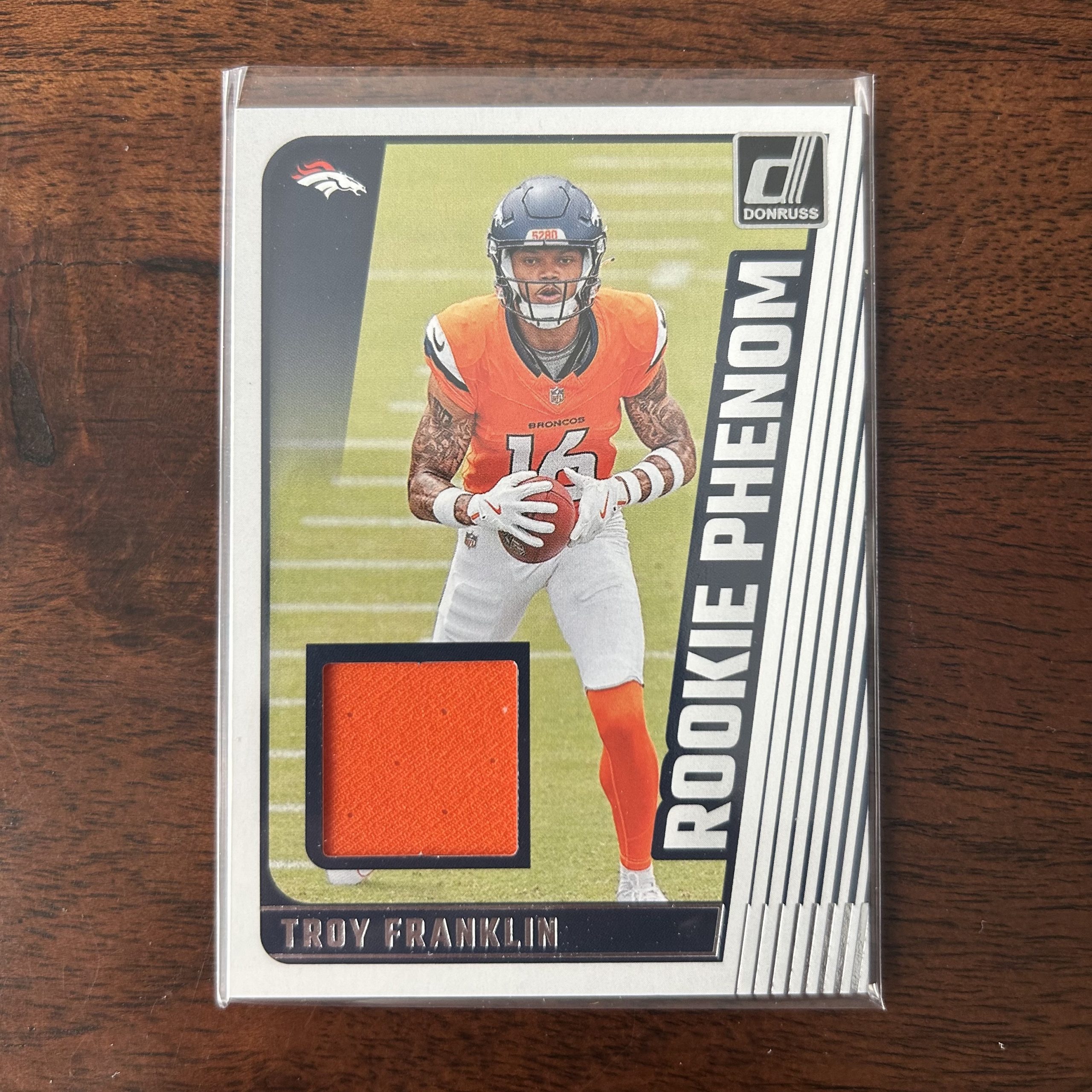 Curated pack of three different Troy Franklin football cards including a Donruss Rookie Phenom mem relic insert RC and a Rookies & Stars RC. Great instant collection bundle of cards for a football fan! You will receive all of the exact cards pictured. Each card will be in a penny sleeve and top loader and they will come in a small pack (team bag) with cover graphic as pictured. Will be shipped very well protected!