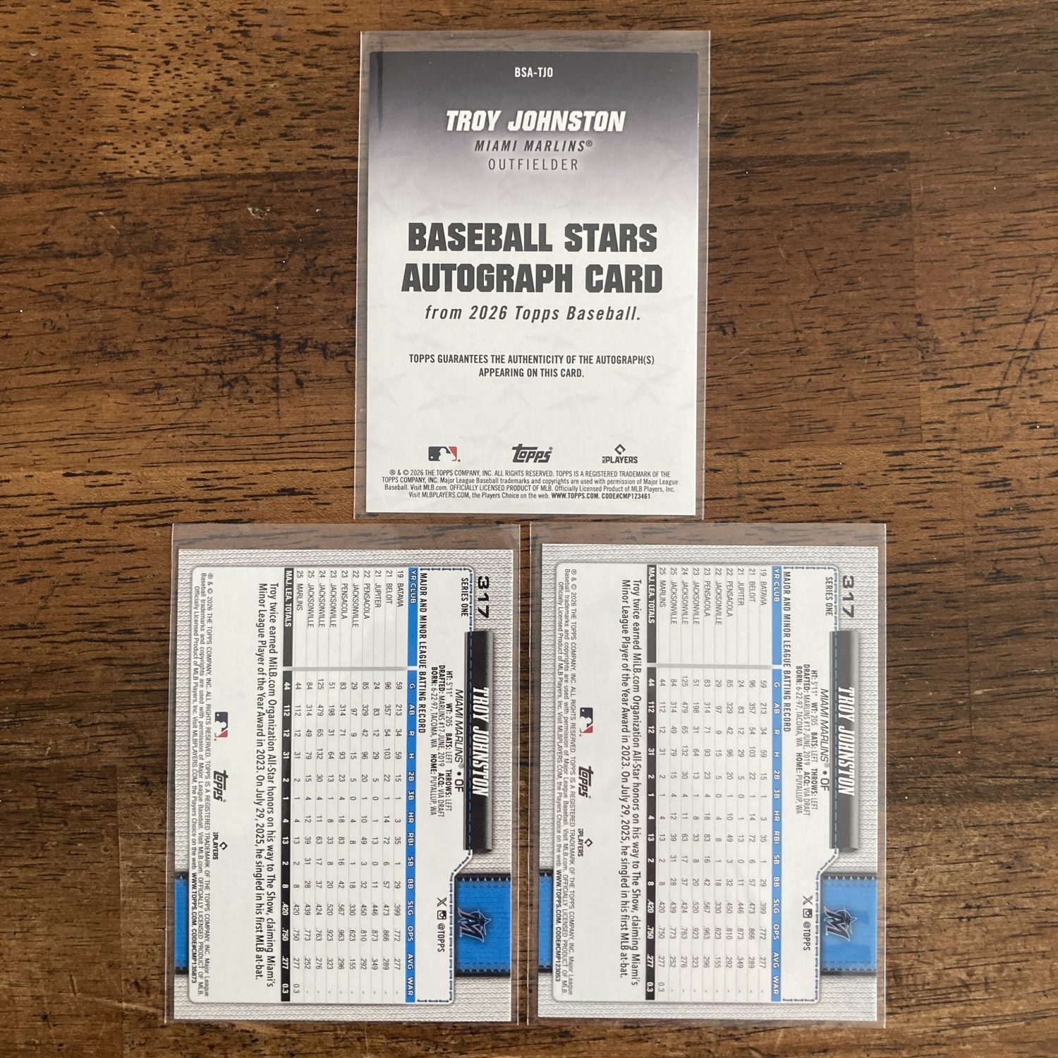 Curated pack of three different Troy Johnston baseball rookie cards from 2026 Topps Series 1 – Baseball Stars Autograph insert auto RC #BSA-TJO, SP Green Easter Holiday foil parallel RC #317, and base RC #317. Nice little instant collection bundle of cards for a baseball fan! You will receive all of the exact cards pictured. Each card will be in a penny sleeve and top loader and they will come in a small pack (team bag) with cover graphic as pictured. Will be shipped very well protected!