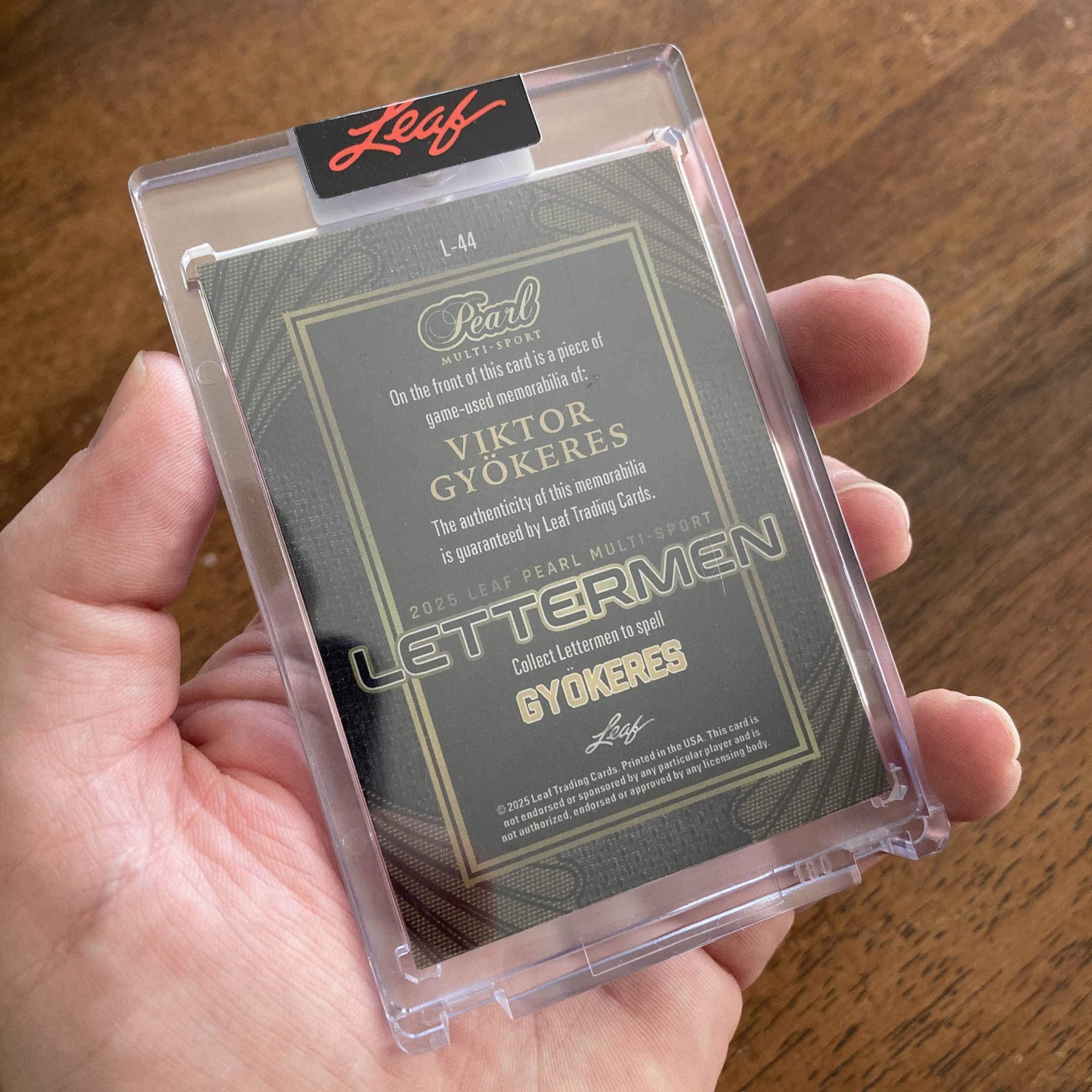 Viktor Gyokeres 2025 Leaf Pearl Multi-Sport SSP Lettermen jumbo game-used name plate memorabilia insert card #L-44, serial numbered 4/8! Awesome jersey relic card of the Arsenal and Sweden national team player. Will be in a penny sleeve and top loader and shipped very well protected!