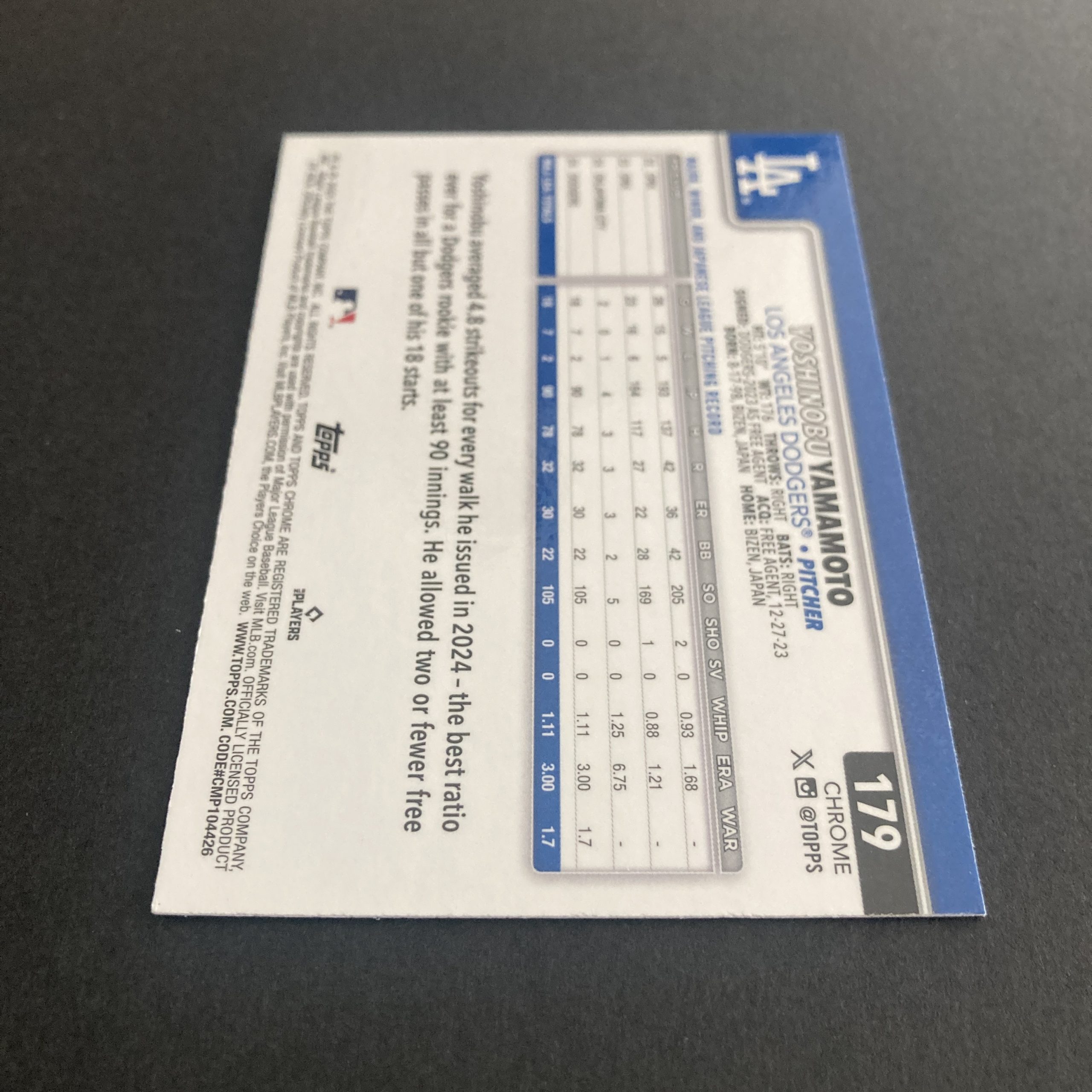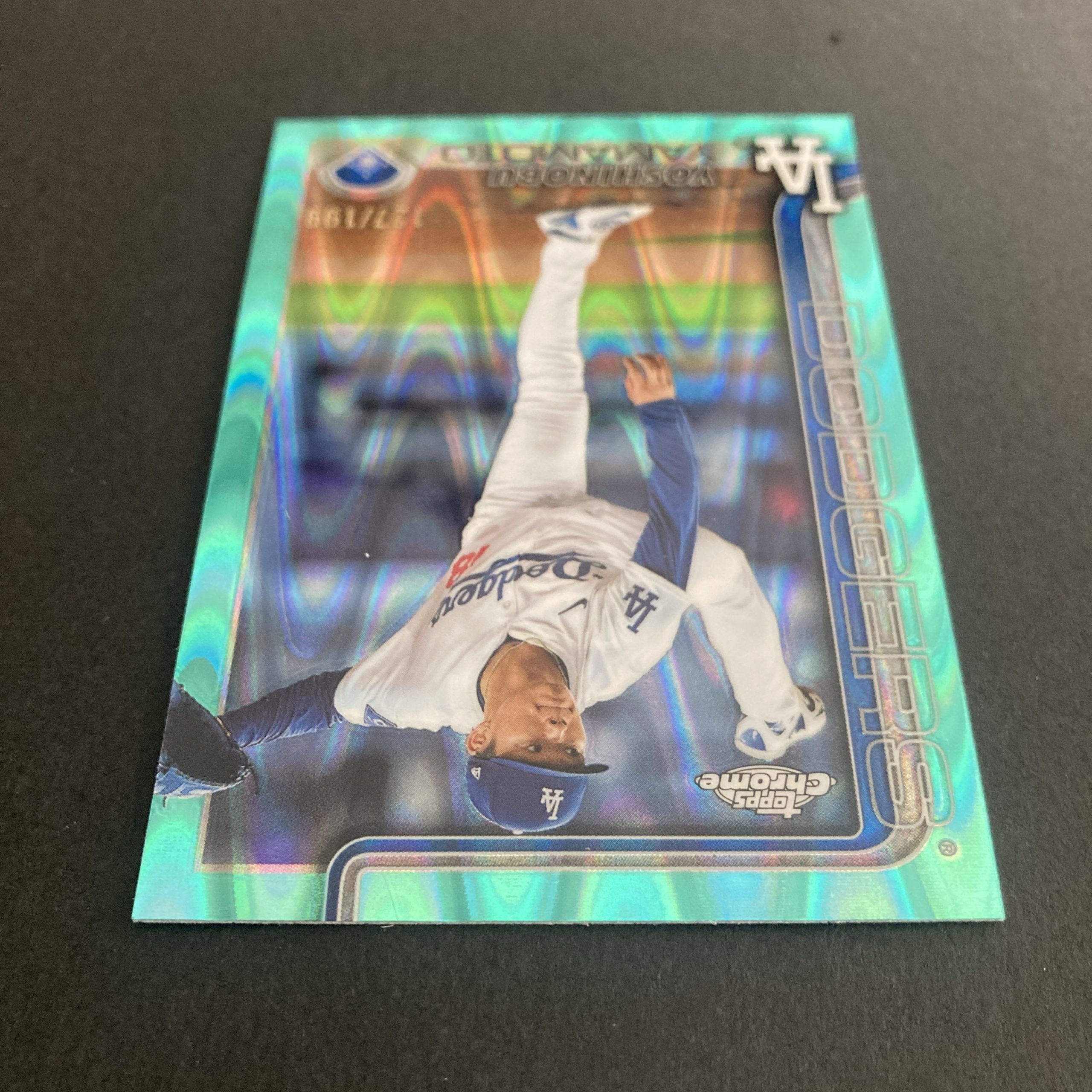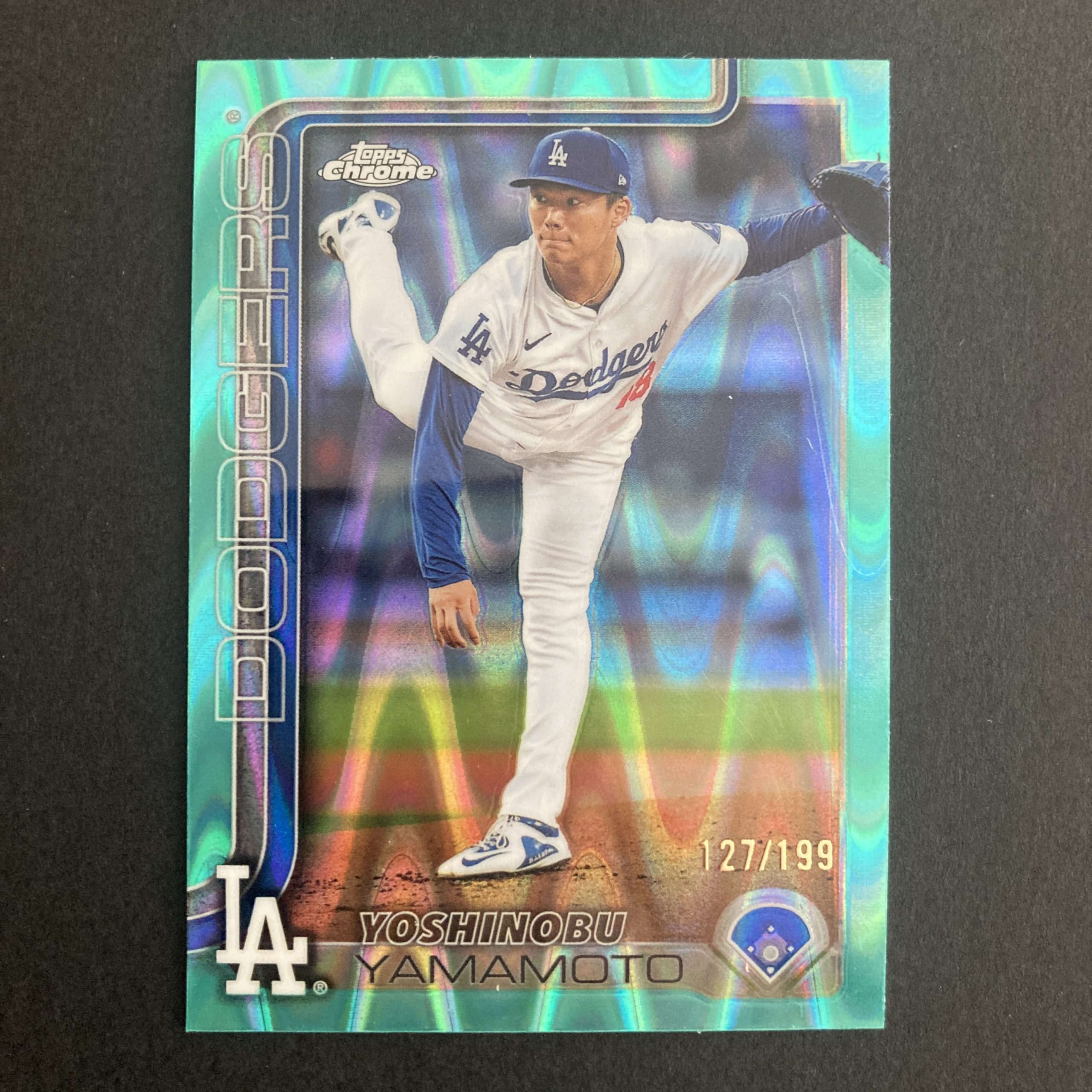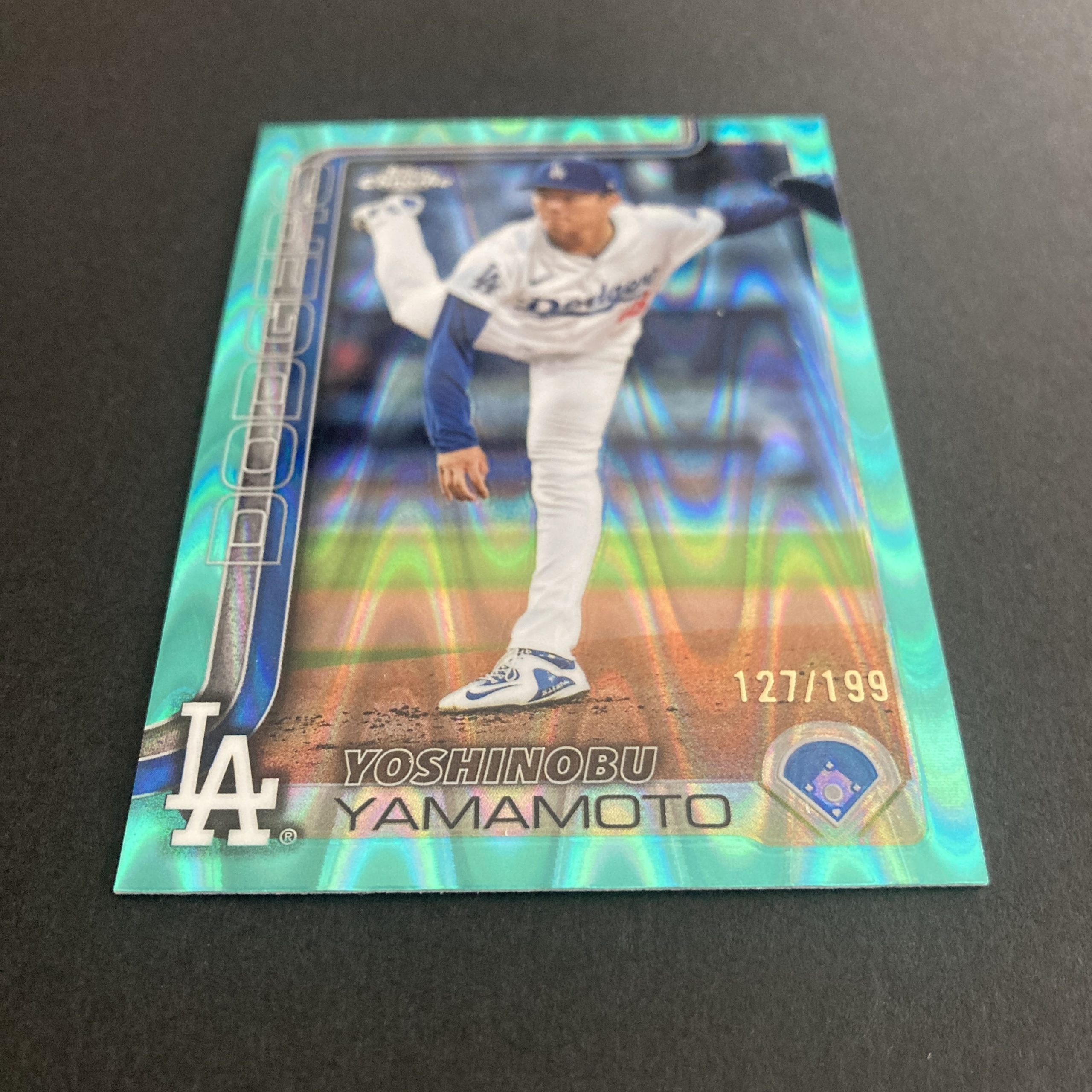 Yoshinobu Yamamoto 2025 Topps Chrome SP Aqua Raywave Refractor parallel card #179, serial numbered 127/199. Los Angeles Dodgers collectible MLB baseball card. Will be in a penny sleeve and top loader and shipped very well protected!