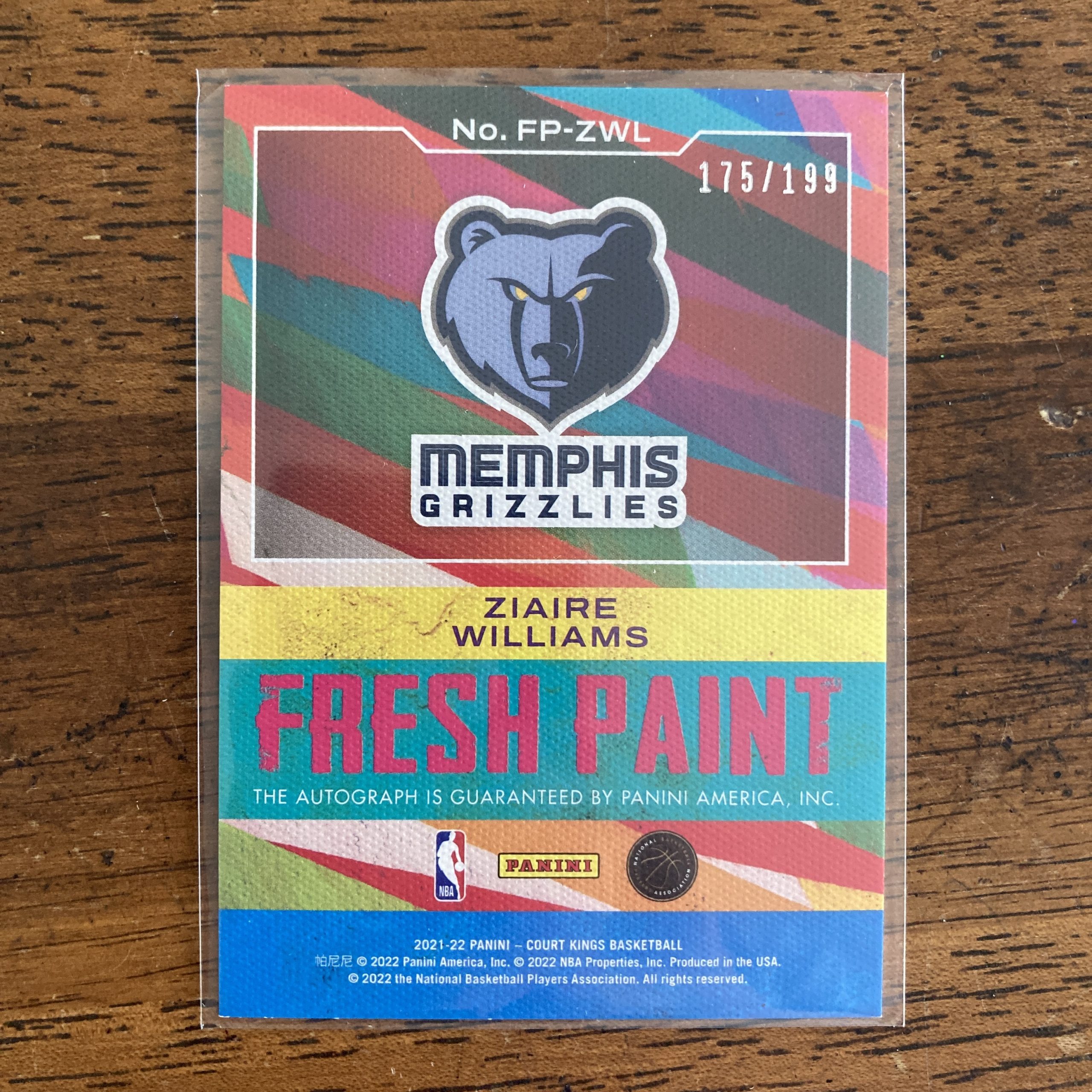 Curated pack of five different Ziaire Williams basketball cards including 2021-22 Panini Court Kings SP Fresh Paint auto (serial numbered 175/199) insert rookie card #FP-ZWL, 2021-22 Panini Prizm base rookie card #313, 2021 Panini Chronicles Donruss Draft Picks Rated Rookie base rookie card #41, 2021-22 Hoops base rookie card #211, and 2023-24 Panini Mosaic Silver Mosaic Prizm card #173. Nice little instant collection bundle of cards for a basketball fan! You will receive all of the exact cards pictured. Each card will be in a penny sleeve and top loader and they will come in a small pack (team bag) with cover graphic as pictured. Will be shipped very well protected!