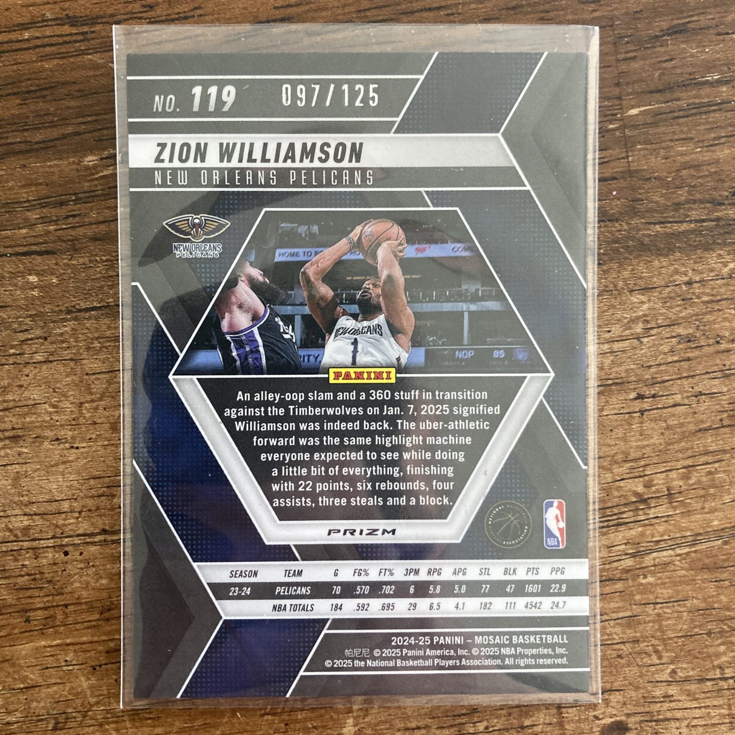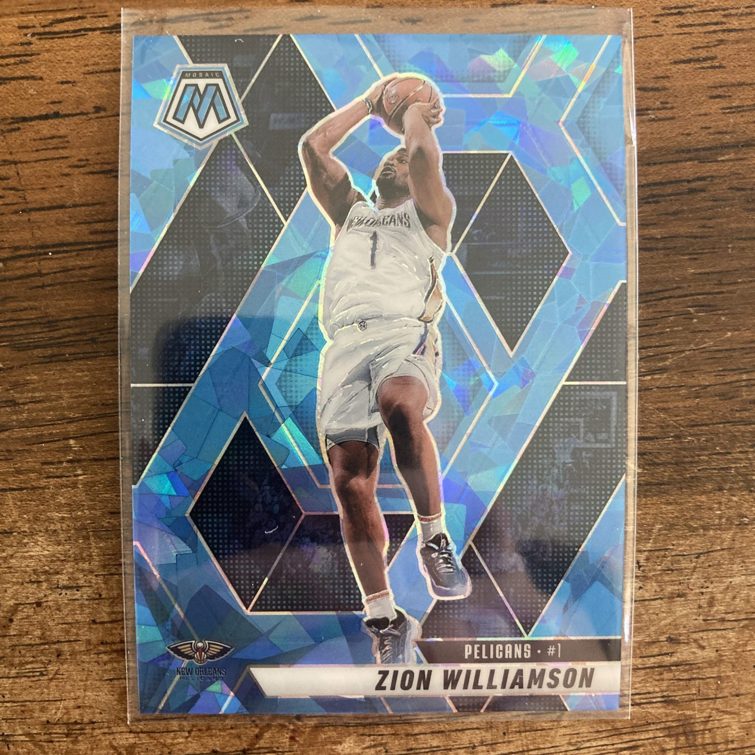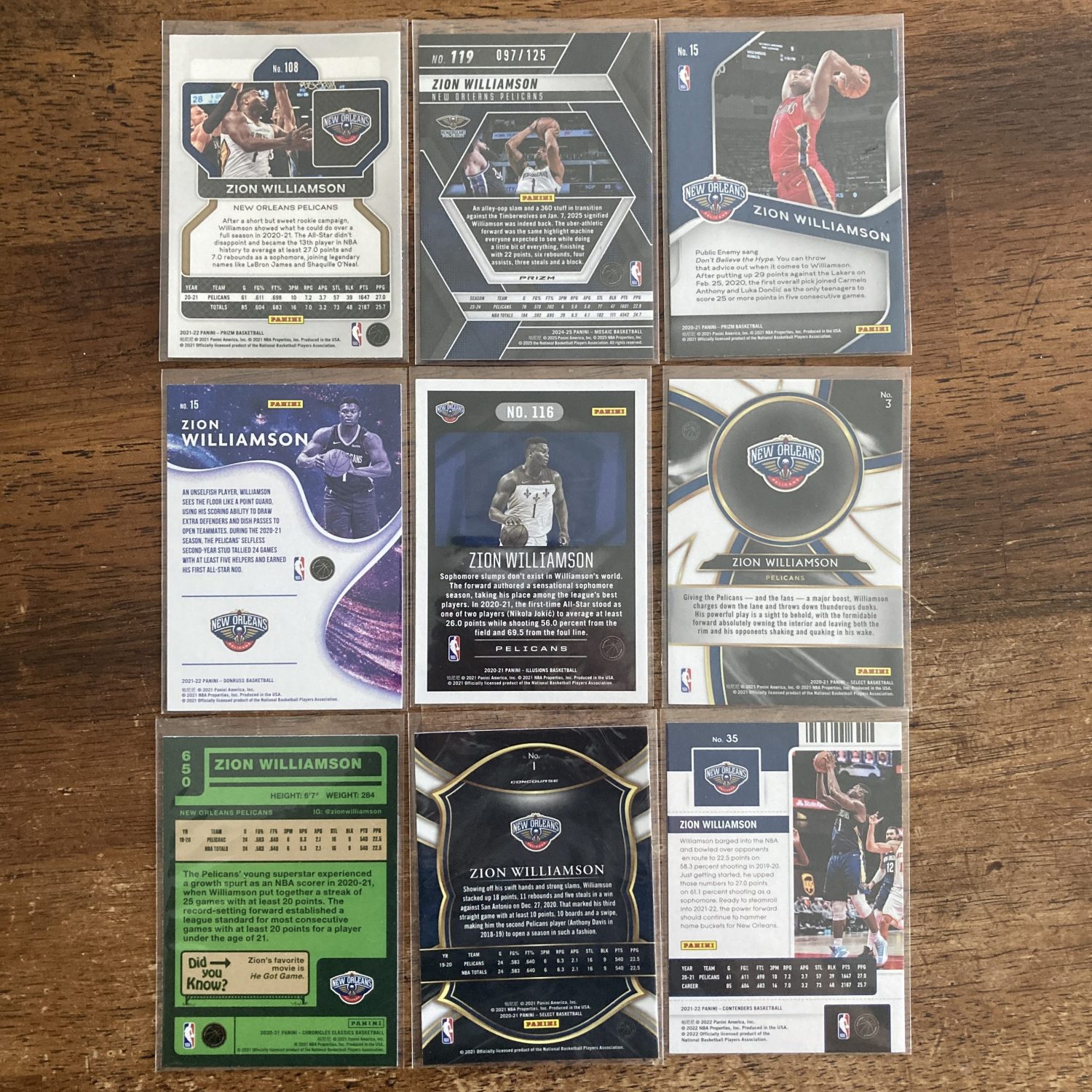 Curated pack of nine different Zion Williamson basketball cards including a Panini Mosaic SP (#’ed 097/125) Blue Mosaic Prizm parallel card with other base and insert cards. Nice little instant collection bundle of cards for a basketball fan! You will receive all of the exact cards pictured. Each card will be in a penny sleeve and top loader and they will come in a small pack (team bag) with cover graphic as pictured. Will be shipped very well protected!